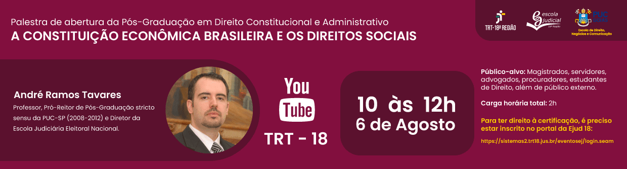 A Escola Judicial do TRT 18 encaminha convite para palestra A Constituição Econômica Brasileira e os Direitos Sociais que será realizado no dia 06 agosto, das 10h às 12h, a ser proferida pelo Prof. Doutor André Ramos Tavares, autor do livro Curso de Direito Constitucional. A palestra é destinada aos magistrados, procuradores do trabalho, servidores, advogados e à comunidade jurídica em geral. A transmissão do evento será pelo canal do YouTube da Escola Judicial.