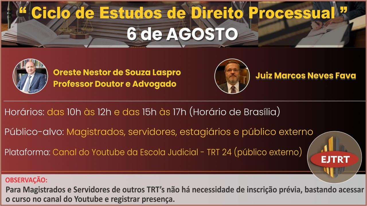 A Escola Judicial do TRT 24 convida para o evento "Ciclo de EStudos de Direito Processual, a ser realizado no dia 06 de agosto, em dois horários no canal da Ejud24 no YouTube.