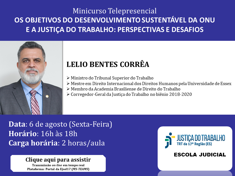 A Escola Judicial do TRT da 17ª Região convida para participar do Minicurso Os Objetivos do Desenvolvimento Sustentável da ONU e a Justiça do Trabalho: Perspectivas e Desafios, que ocorrerá no dia 06 de agosto (Sexta-Feira), das 16h às 18h, com carga horária de 2 horas, o minicurso será ministrado pelo Ministro Lelio Bentes Corrêa