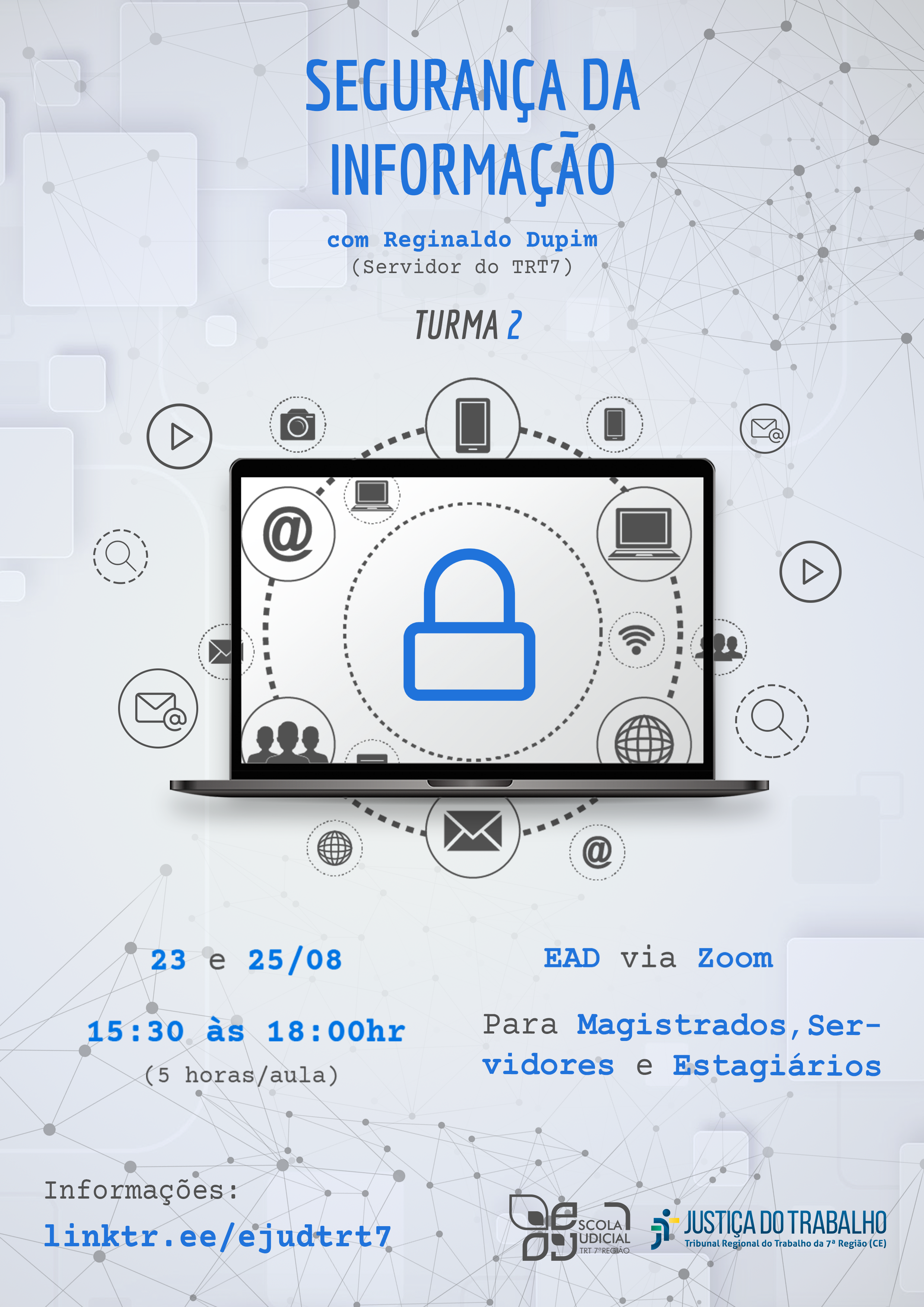 Com carga horária de 05 horas/aula, o treinamento tem como objetivo capacitar magistrados, servidores e estagiários nos conceitos gerais de segurança da informação, nos normativos do TRT7 que tratam do tema e dos cuidados necessários para reduzir o risco de incidentes de segurança da informação.