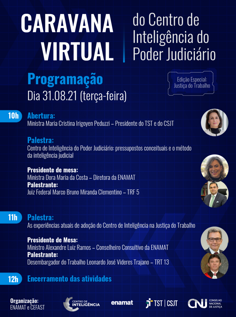 A Escola Nacional de Formação e Aperfeiçoamento de Magistrados do Trabalho - ENAMAT e o Centro de Formação e Aperfeiçoamento de Assessores e Servidores do Tribunal Superior do Trabalho – CEFAST realizarão a Caravana Virtual do Centro de Inteligência do Poder Judiciário – Edição Especial da Justiça do Trabalho, no dia 31 de agosto de 2021, das 10h às 12h, por meio de transmissão ao vivo no canal do Youtube da ENAMAT, destinado a Magistrados e Servidores da Justiça do Trabalho e também outros interessados, com o total de 2 horas-aula.