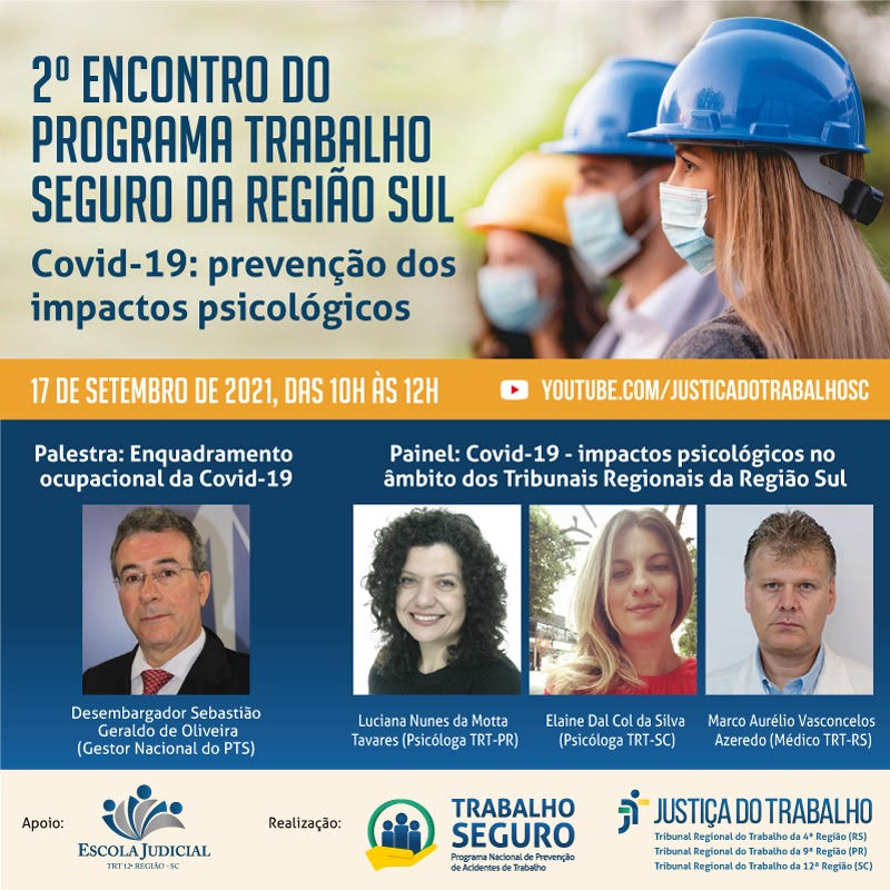 A Escola Judicial do TRT da 12ª Região convida para 2º Encontro do Programa Trabalho Seguro da Região Sul - COVID19: prevenção dos impactos psicológicos, no dia 17 de setembro, das 10h às 12h, no canal do YouTube da EJUD12.