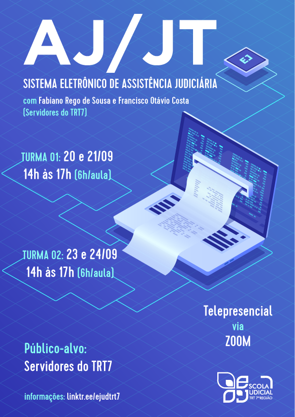 A Escola Judicial do TRT da 07ª Região promoverá o curso "Sistema Eletrônico de Assistência Judiciária – AJ/JT – Cadastro, nomeação e pagamento e seu reflexo no PJe" que será ministrado pelos instrutores Fabiano Rego de Sousa e Francisco Otávio Costa, Servidores do TRT7.