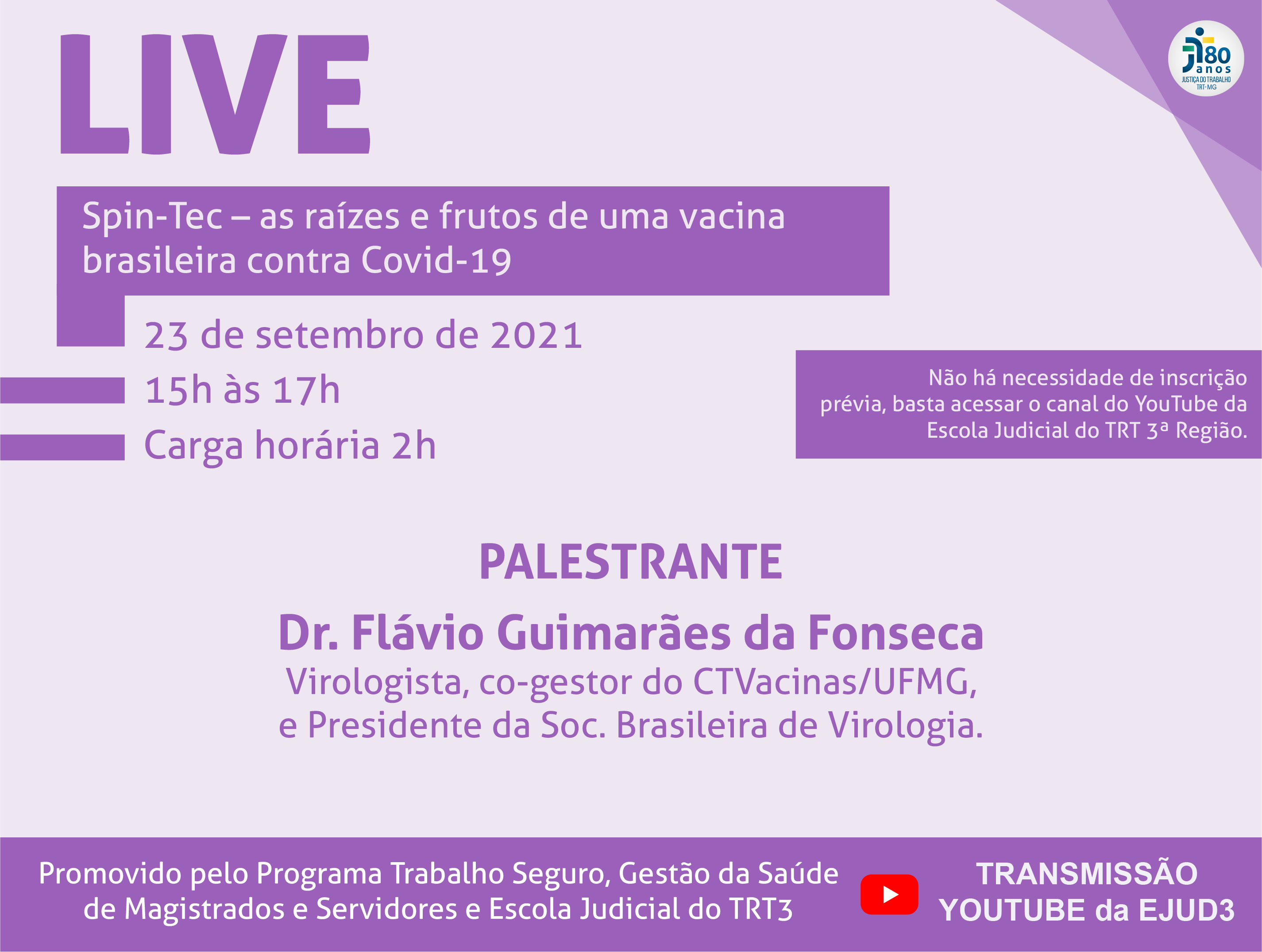 A Escola Judicial do TRT de Minas Gerais (3ª Região) transmitirá ao vivo, no seu Canal do YouTube, a LIVE “Spin-Tec – as raízes e frutos de uma vacina brasileira contra Covid-19” , no dia 23 de setembro de 2021, das 15h às 17h, com o palestrante Dr. Flávio Guimarães da Fonseca.