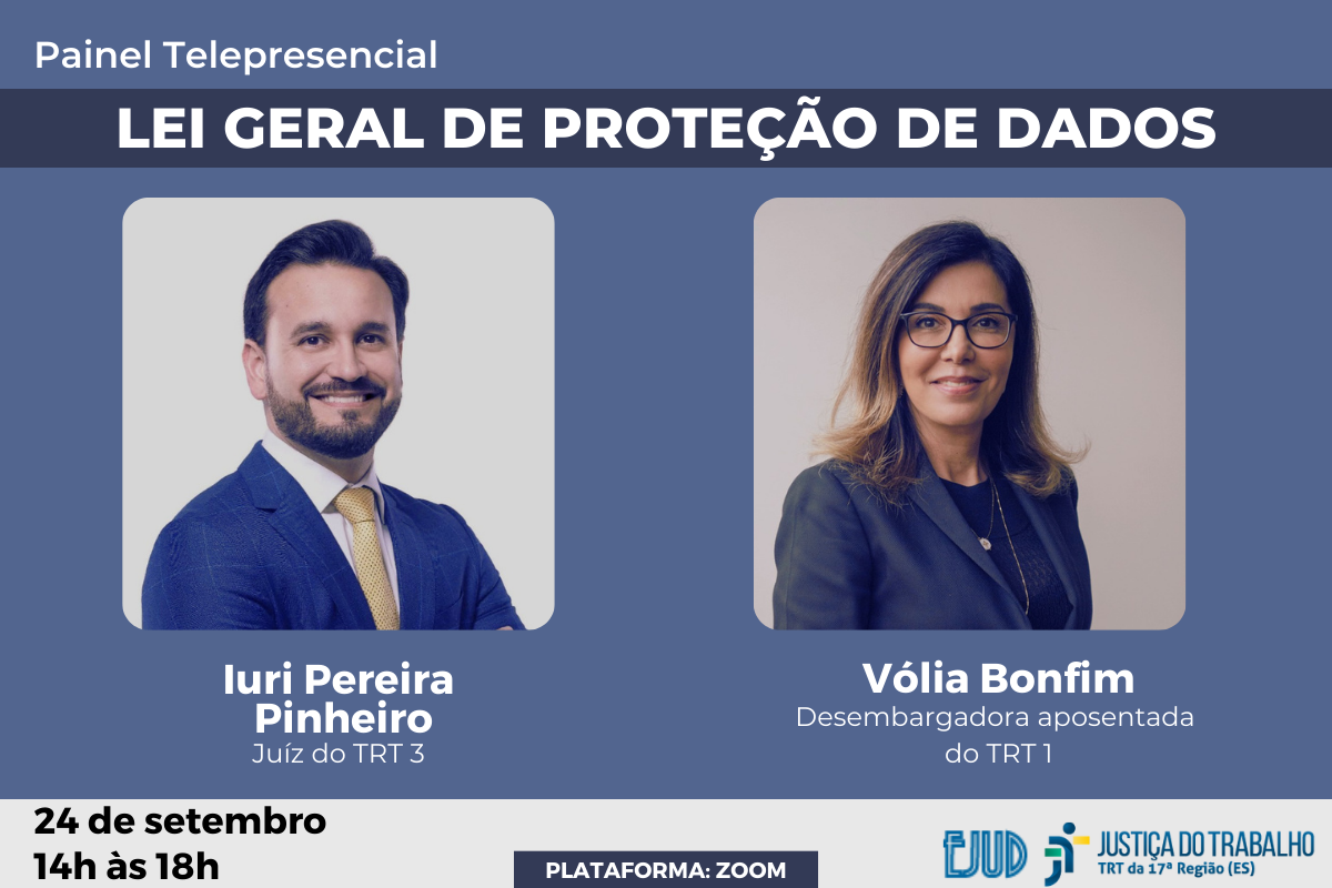 A Escola Judicial do TRT da 17ª Região convida para participar do Painel Telepresencial Lei Geral de Proteção de Dados , que ocorrerá no dia 24 de setembro (Sexta-Feira), das 14h às 18h, com carga horária de 4 horas, o minicurso será ministrado por Iuri Pereira Pinheiro e Vólia Bonfim.