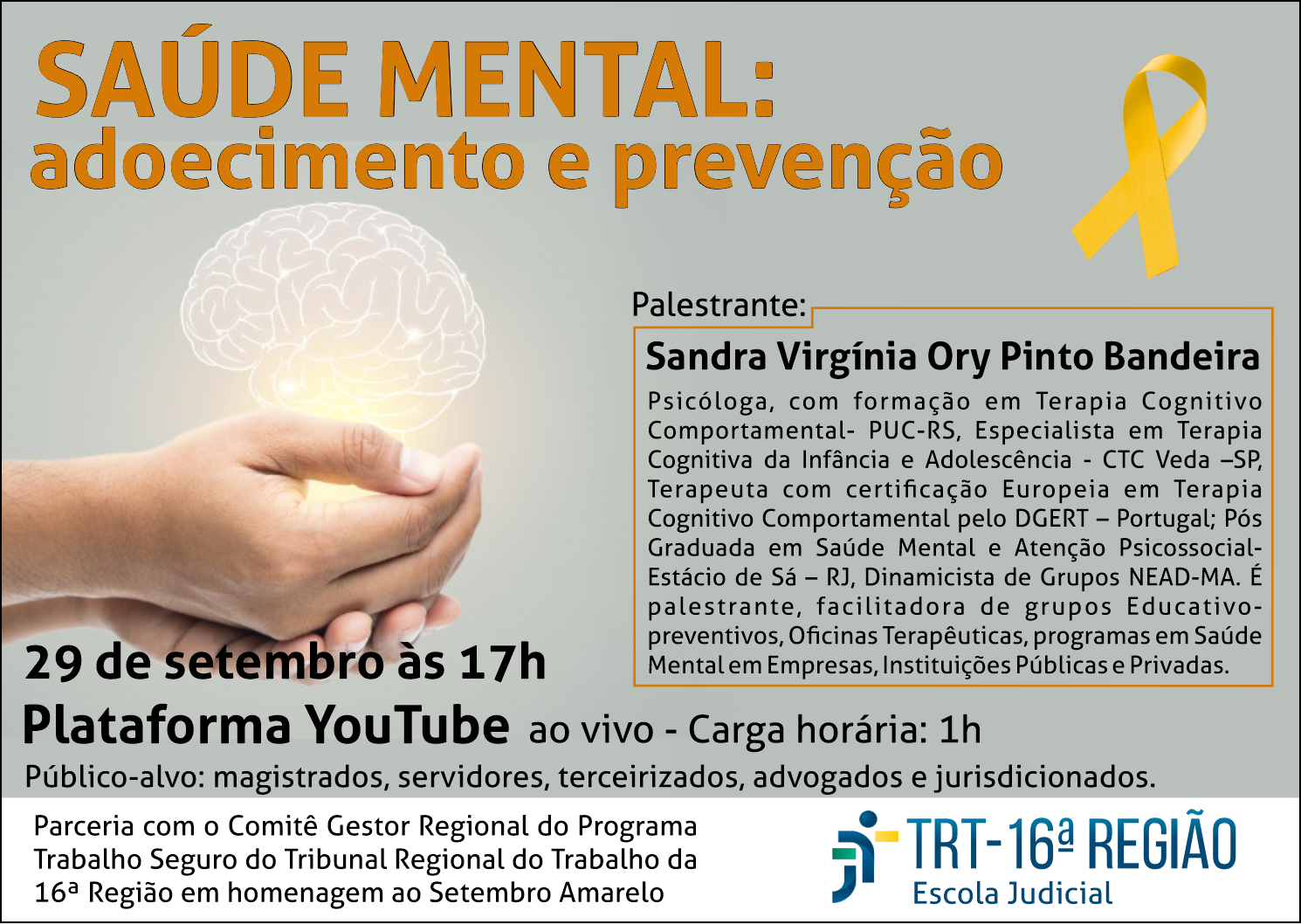 A EJUD16 convida para o palestra "Saúde Mental: Adoecimento e Prevenção" que será realizado no dia 29 de setembro de 2021, as 17h, no canal do YouTube da EJUD16.