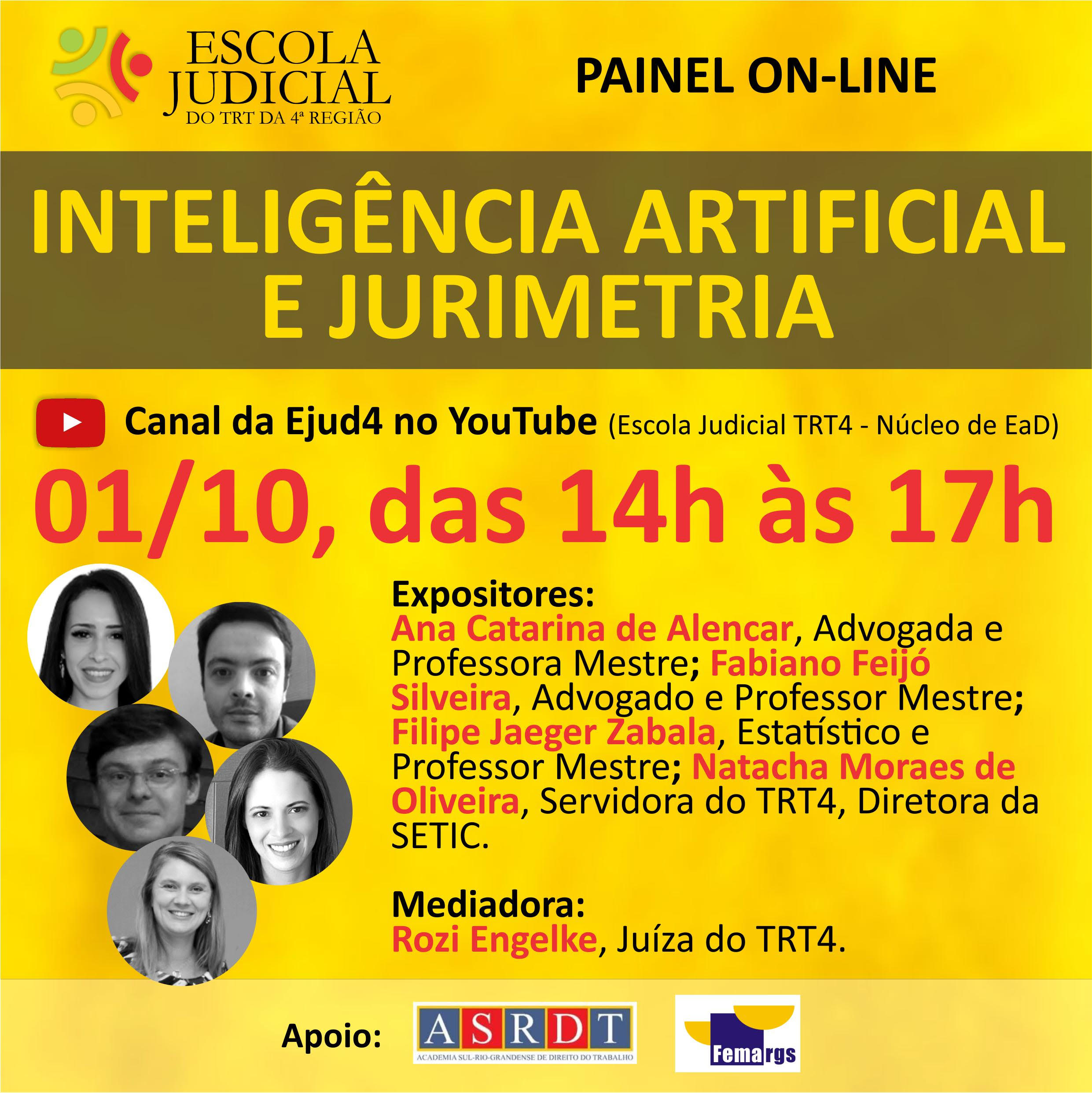 A Escola Judicial do TRT4 convida para o Painel On-line - Inteligência Artificial e Jurimetria, que será realizada do dia 01 de outubro das 14h às 17h, no canal da Ejud4 no YouTube.