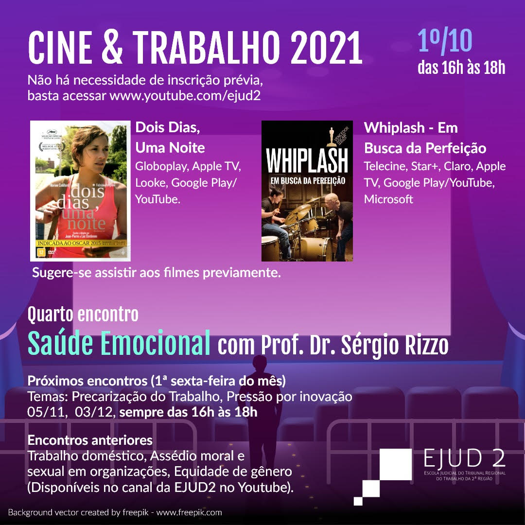 A Ejud2 realizará a 4º palestra do ciclo de palestras chamado Cine e Trabalho 2021. O ciclo é composto por 6 encontros, o 4º com o tema " Saúde Emocional " será realizado dia 1 de outubro das 16h às 18h pelo palestrante Professor Sérgio Rizzo.