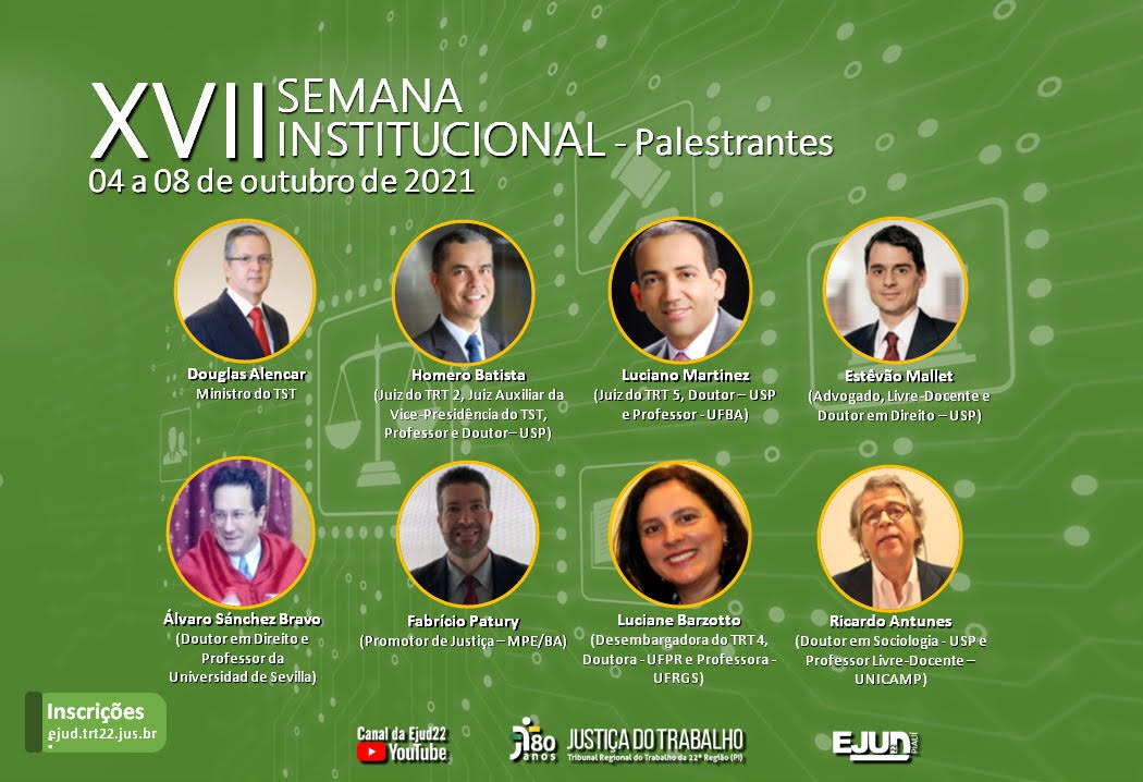 A EJUD22 promoverá XVII Semana Institucional, que acontecerá nos dias 04 a 08 de outubro de 2021, das 8h às 14h, pelo Canal da EJUD22 no Youtube, com carga horária de 30 horas aula.