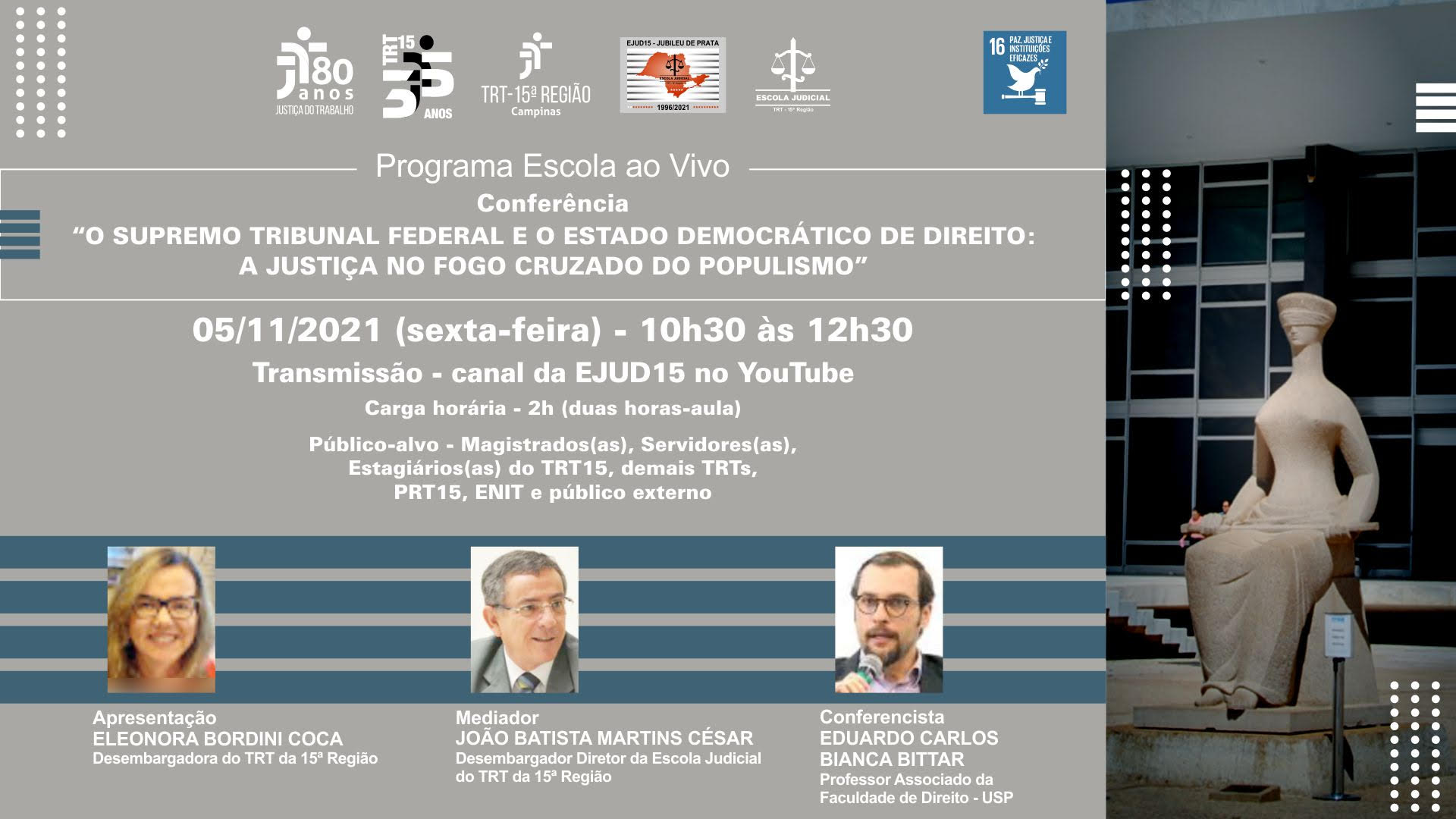 A Escola Judicial do TRT 15 convida para a Conferência "O STF e o Estado Democrático de Direito", no dia 05 de novembro de 2021 das 10h30 ás 12h30. Transmissão - canal da EJUD15 no YouTube.