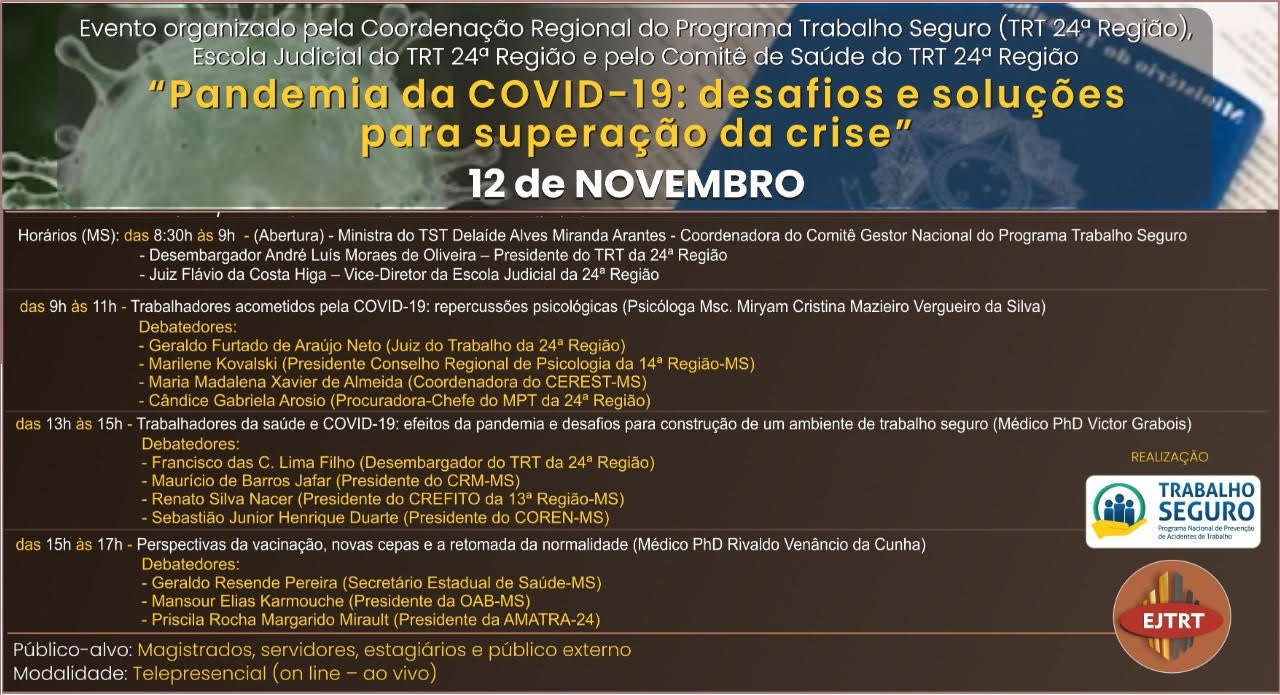 A Escola Judicial do TRT 24 convida para o Webinário “Pandemia da COVID-19: desafios e soluções para superação da crise” , a ser realizado no dia 12 de novembro, das 9h30 no canal da Ejud24 no YouTube.