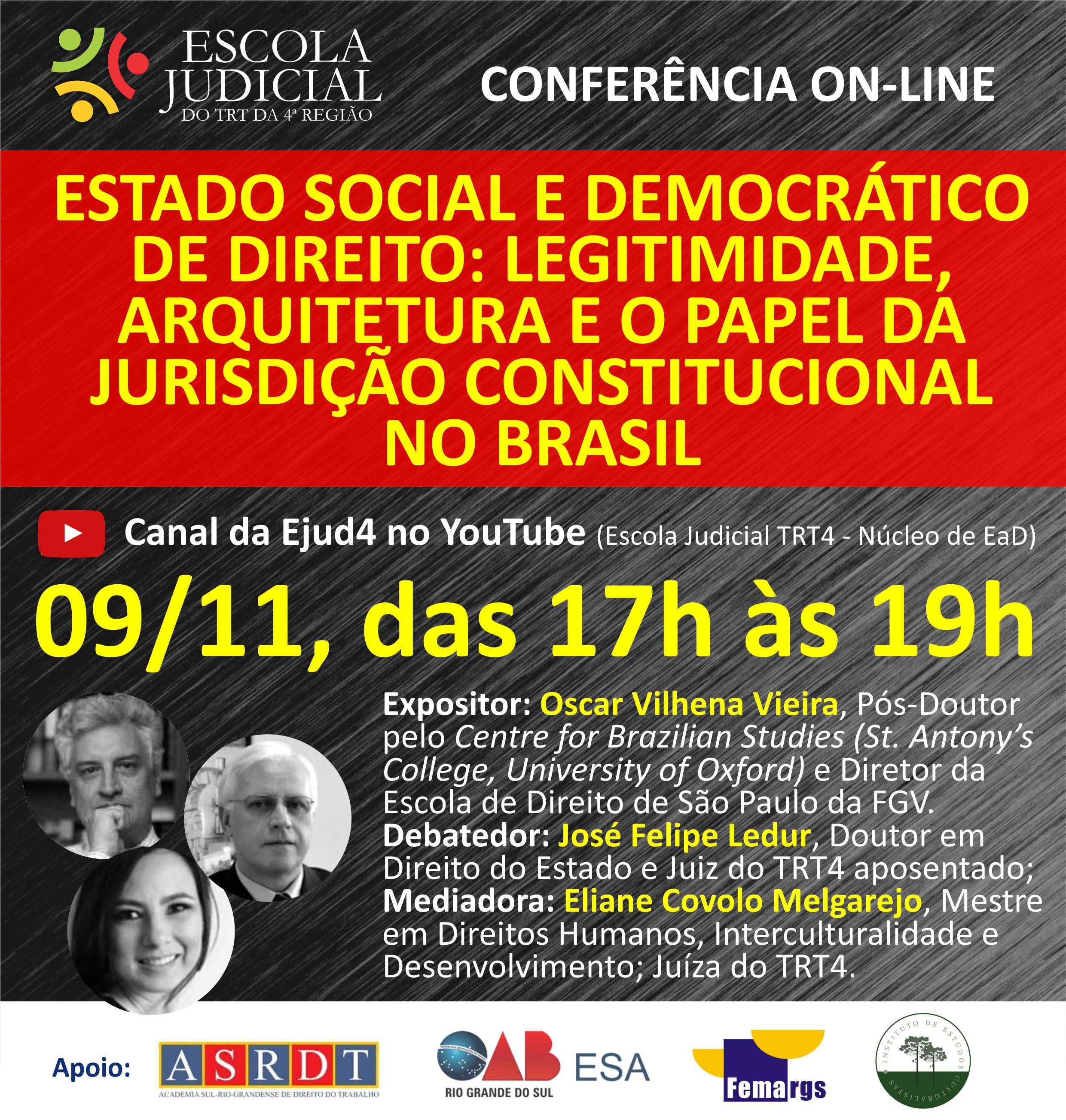 A Escola Judicial do TRT4 convida para o Conferência On-Line - Estado Social e Democrático de Direito: Legitimidade, Arquitetura e o Papel da Jurisdição Constitucional no Brasil, que será realizada do dia 09 de novembro das 17h às 19h, no canal da Ejud4 no YouTube.