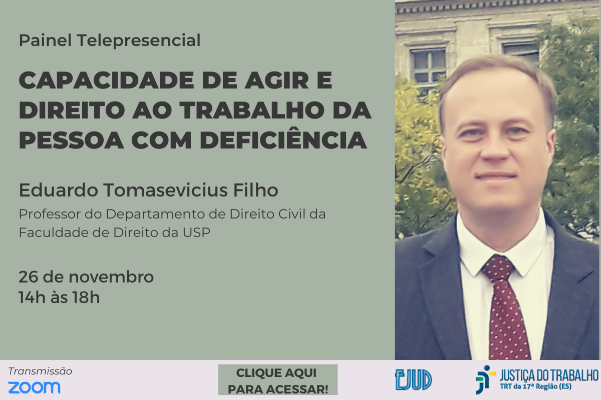 A Escola Judicial do TRT da 17ª Região convida para participar do Painel Telepresencial, abordando o tema Capacidade de Agir e Direito ao Trabalho da Pessoa com Deficiência , que ocorrerá no dia 26 de novembro (Sexta-Feira), das 14h às 18h, com carga horária de 4 horas, o painel será ministrado por Eduardo Tomasevicius Filho.