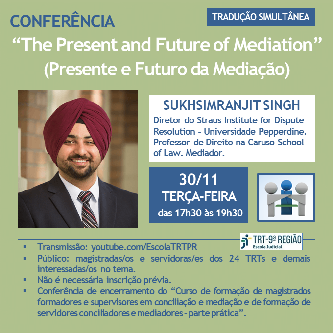 A Escola Judicial do TRT do Paraná (9ª Região) transmitirá ao vivo, em 30 de novembro de 2021, das 17h30 às 19h30, no seu Canal no YouTube, com tradução simultânea, a conferência “The Present and Future of Mediation” (Presente e Futuro da Mediação) a ser proferida por Sukhsimranjit Singh.