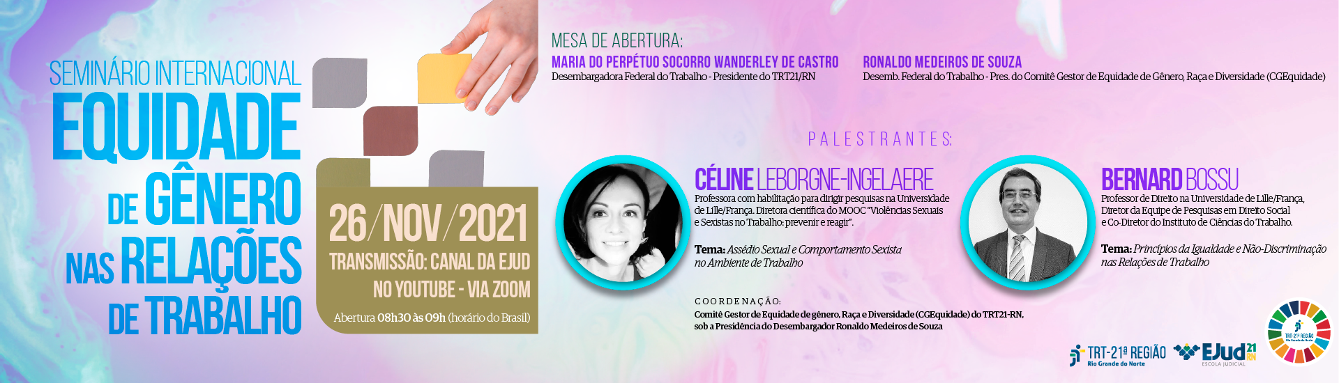 Com o apoio do Comitê Gestor de Equidade de gênero, Raça e Diversidade (CGEquidade) do TRT-21, a Escola Judicial do TRT da 21ª Região realizará, no dia 26 de novembro, das 08h30 às 12h30, o Seminário Internacional sobre Equidade de Gênero nas Relações de Trabalho. A ação será transmitida no canal do YouTube da EJud21.