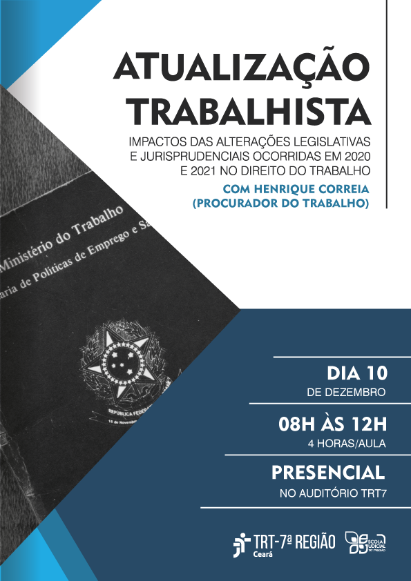 Inscrições abertas para o curso Atualização Trabalhista: impactos das alterações legislativas e jurisprudenciais ocorridas em 2020 e 2021 no Direito do Trabalho, que será ministrado por Henrique Correia - Procurador do Trabalho, no dia 10 de dezembro de 2021 das 08h às 12h.
