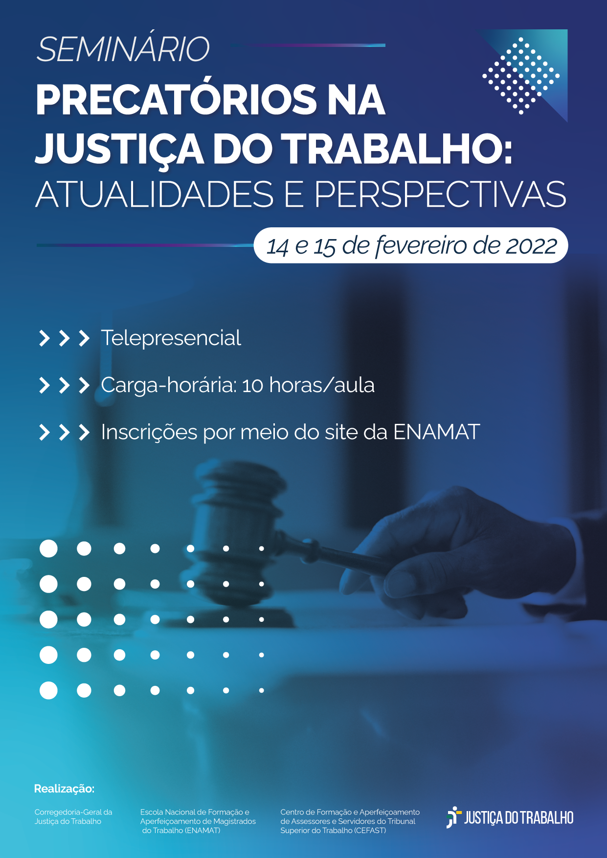 A Corregedoria Geral da Justiça do Trabalho – CGJT, a Escola Nacional de Formação e Aperfeiçoamento de Magistrados do Trabalho – ENAMAT e o Centro de Formação e Aperfeiçoamento de Assessores e Servidores do Tribunal Superior do Trabalho – CEFAST realizarão em conjunto o Seminário sobre Precatórios na Justiça do Trabalho: Atualidades e Perspectivas nos dias 14 (segunda-feira), das 14h às 18h, e 15 (terça-feira) de fevereiro de 2022, das 9h30 às 17h30, na modalidade telepresencial, para os Magistrados(as) e Servidores(as) da Justiça do Trabalho interessados na temática.