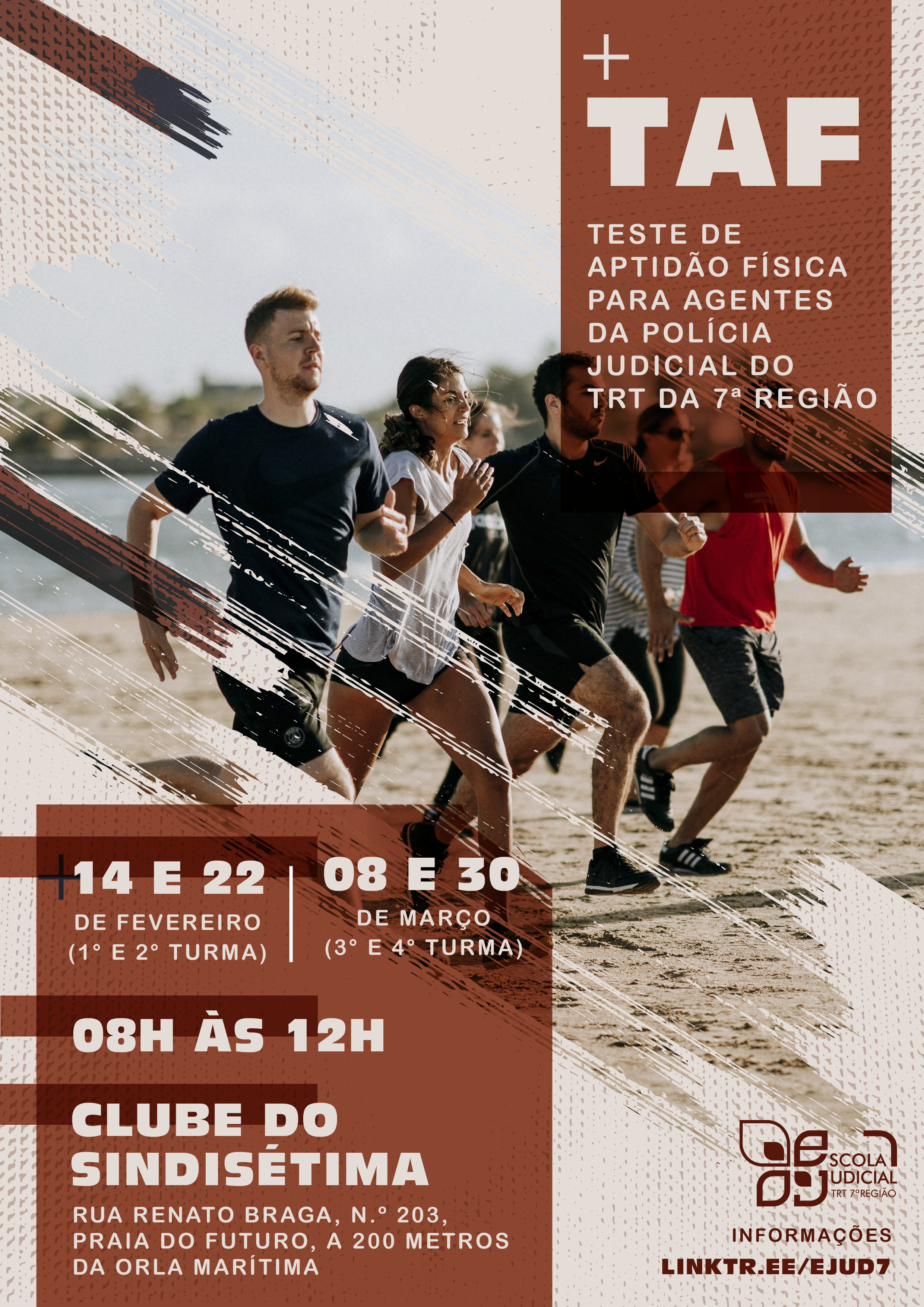 Inscrições abertas para os Agentes de Polícia Judicial do TRT da 7ª Região realizarem o "Teste de Aptidão Física - TAF - 2021", que será acompanhado pelo instrutor Antônio Carlos Braga do Amaral, na Sede Social (Clube) do Sindissétima - Rua Renato Braga, n.º 203, Praia do Futuro, a 200 metros da orla marítima