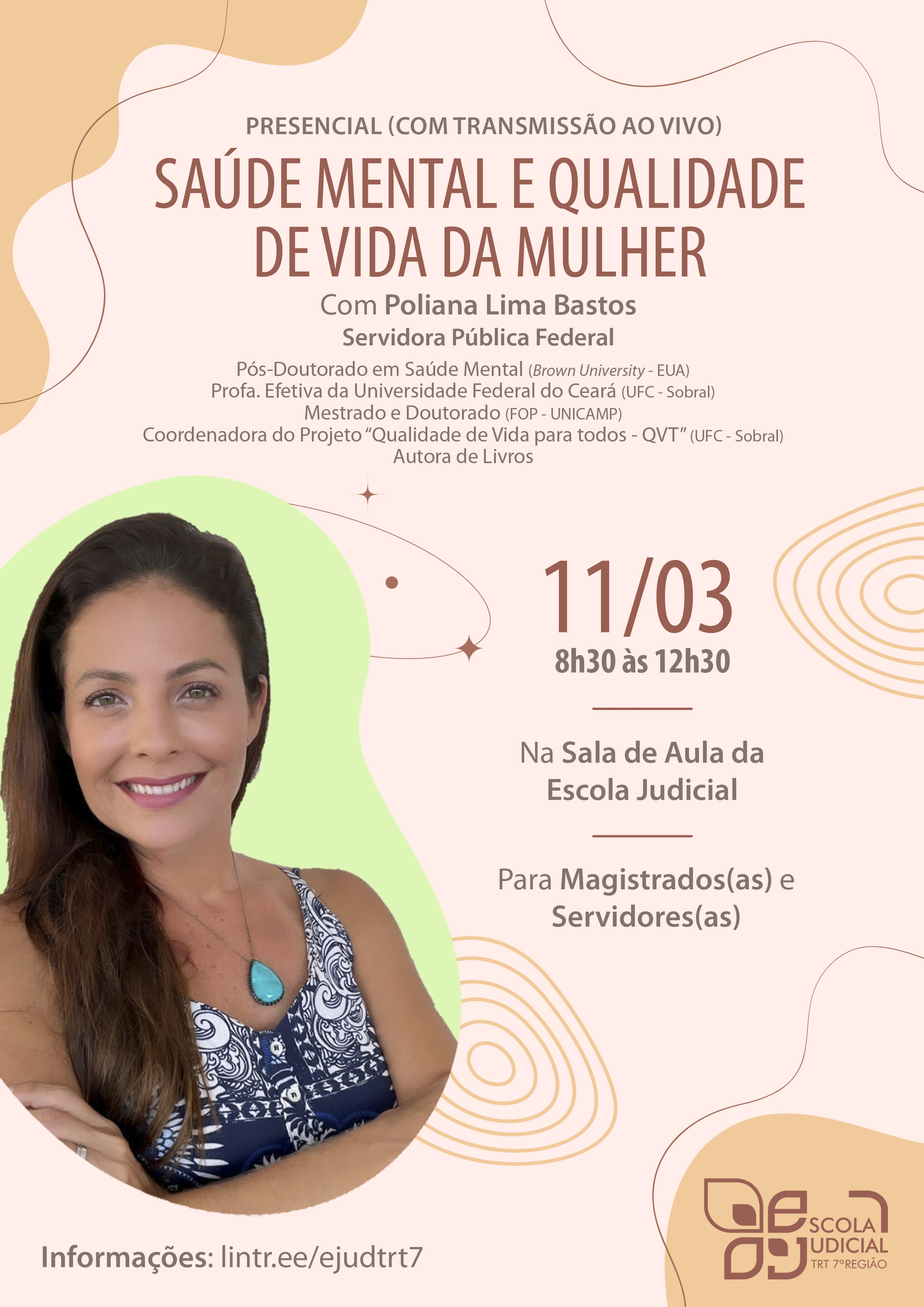 Será realizada no dia 11 de março de 2022, das 08h30min às 12h30min, na Sala de aula da Escola Judicial do TRT da 07ª Região a Oficina "Saúde Mental e Qualidade de Vida da Mulher", com a instrutora Poliana Lima Bastos, Prof(a). Efetiva Universidade Federal do Ceará (UFC- Sobral) com Pós-Doutorado em Saúde Mental (Brown University- EUA), e terá como público-alvo magistrados(as) e servidores(as).