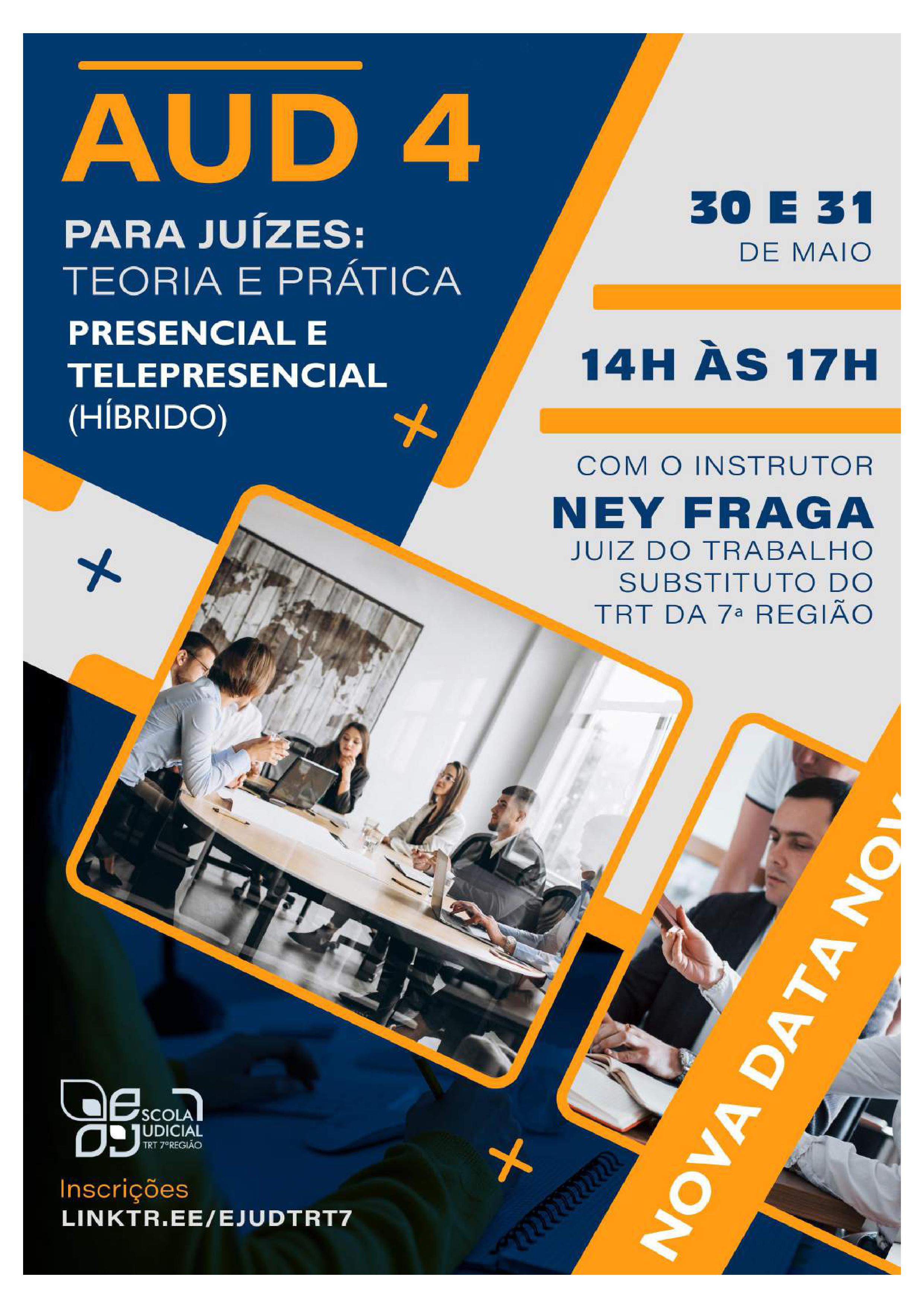 Inscrições abertas para o curso "AUD 4 para Juízes: teoria e prática" que será ministrado por Ney Fraga Filho - Juiz do Trabalho Substituto do TRT da 7ª Região, em novas datas, nos dias 30 e 31 de maio de 2022, das 14h às 17h, na modalidade presencial e telepresencial, na Escola Judicial.