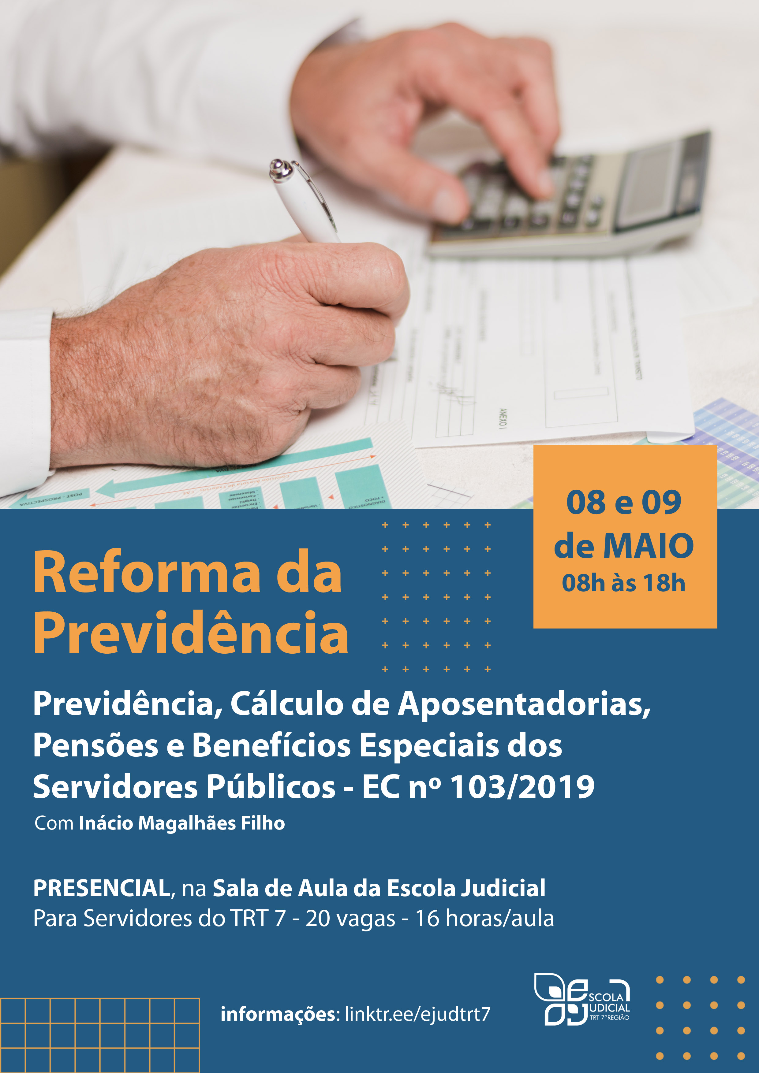O Tribunal Regional do Trabalho da 7ª Região, por meio de sua Escola Judicial, realizará o Curso Reforma da Previdência – Previdência, Cálculo de Aposentadorias, Pensões e Benefícios Especiais dos Servidores Públicos – EC nº 103/2019, que será ministrado pelo Professor Inácio Magalhães Filho, nos dias 08 e 09 de maio de 2023, das 08h às 18h, na modalidade presencial, na sala de aula da Escola Judicial.