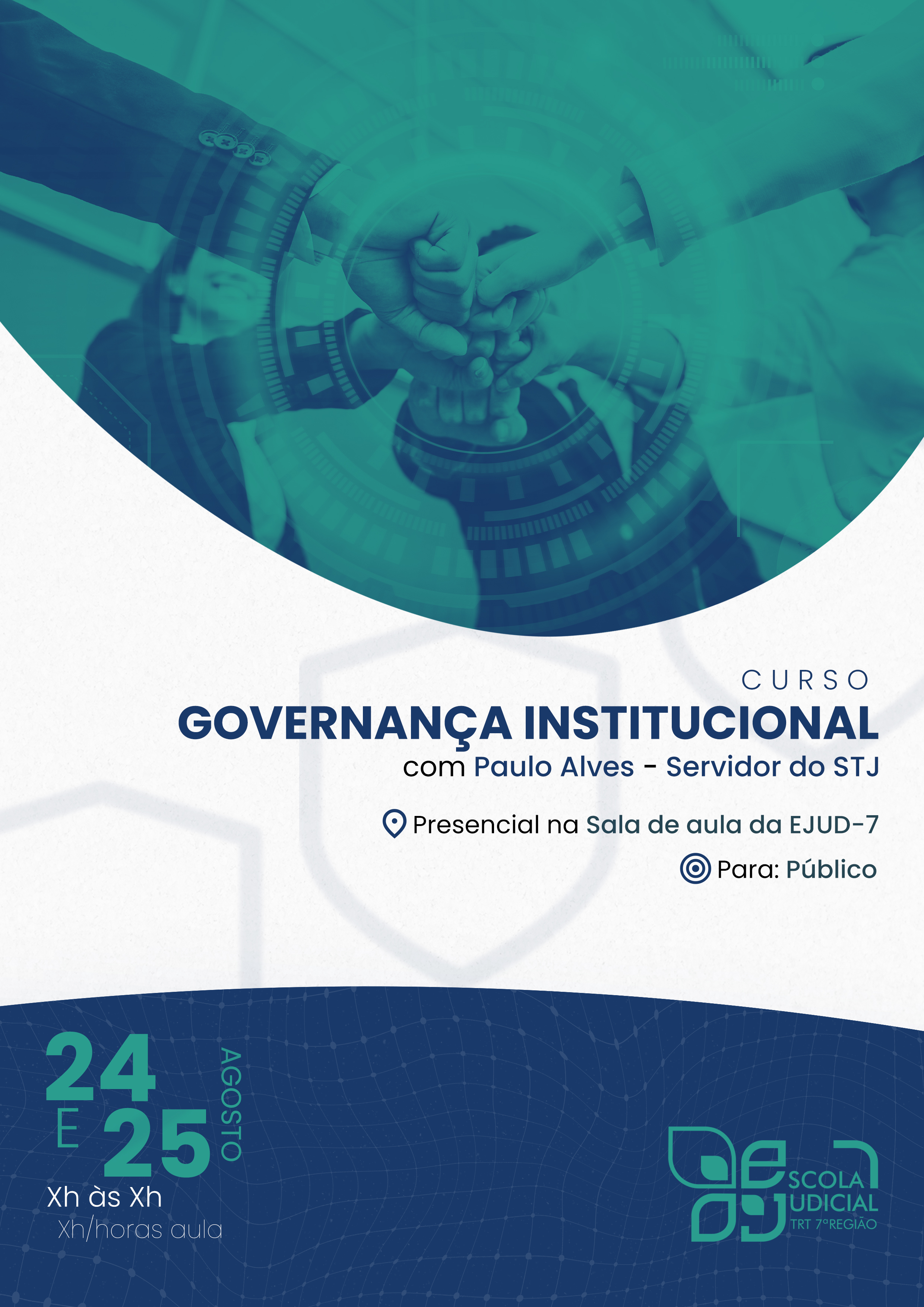 A Escola Judicial abre as inscrições para o curso sobre Governança Institucional, nos dias 24 e 25 de agosto de 2023, no horário das 8h às 12h e das 13h às 17h, de forma presencial, na Sala de Aula da Escola Judicial.
