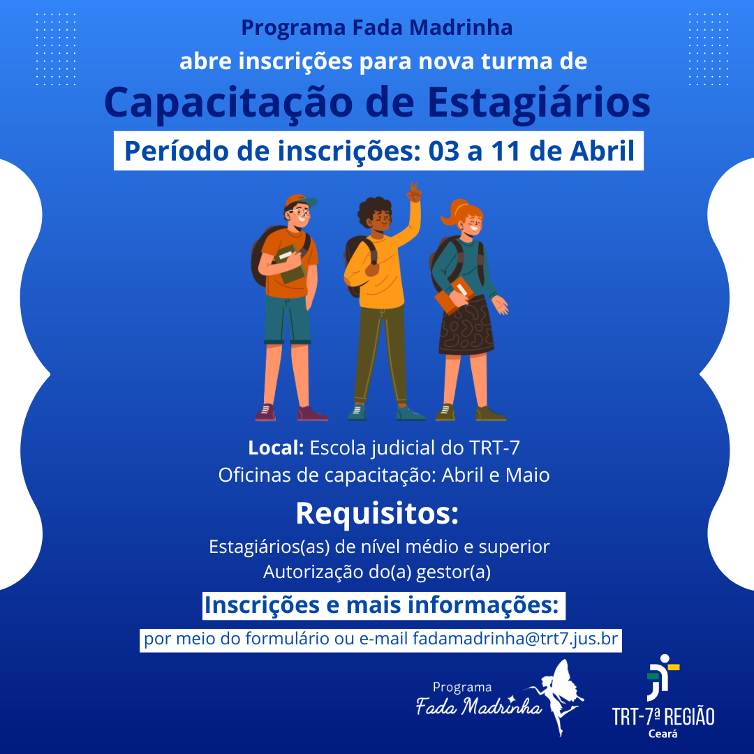 Programa Fada Madrinha inicia capacitação para estagiários de nível médio e superior. As inscrições vão até o dia 11 de abril. As cinco oficinas preparatórias ocorrem em abril e maio na Escola Judicial do TRT-7. As exposições abordam temas como saúde mental, educação financeira, sustentabilidade e preparação para o mercado de trabalho.