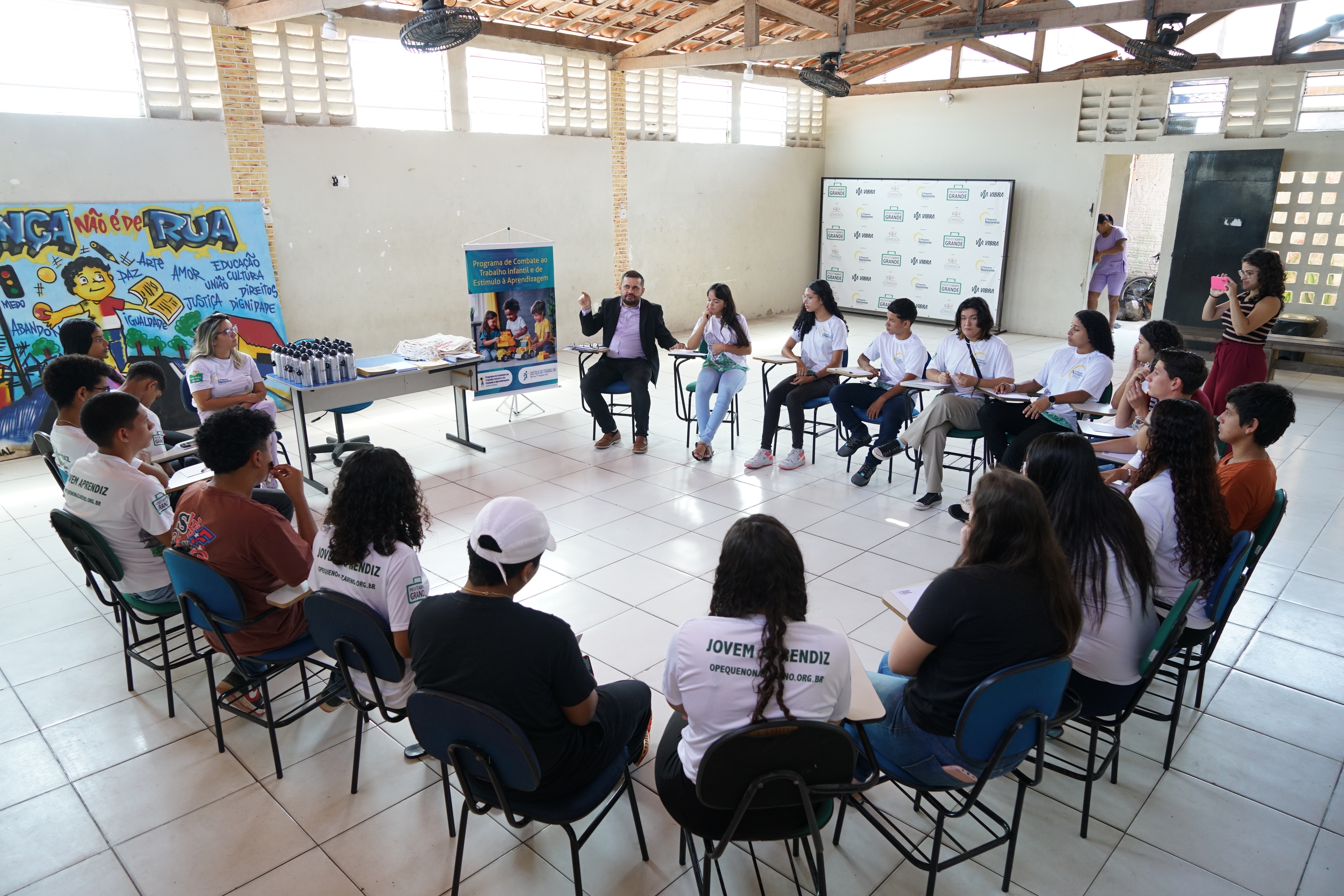 Na segunda-feira, dia 26/8, ocorreu pela manhã uma roda de conversa referente à Semana Nacional da Aprendizagem, mediada pelo juiz do trabalho Antônio Célio Timbó, na associação O Pequeno Nazareno, localizada no bairro Vicente Pinzón.