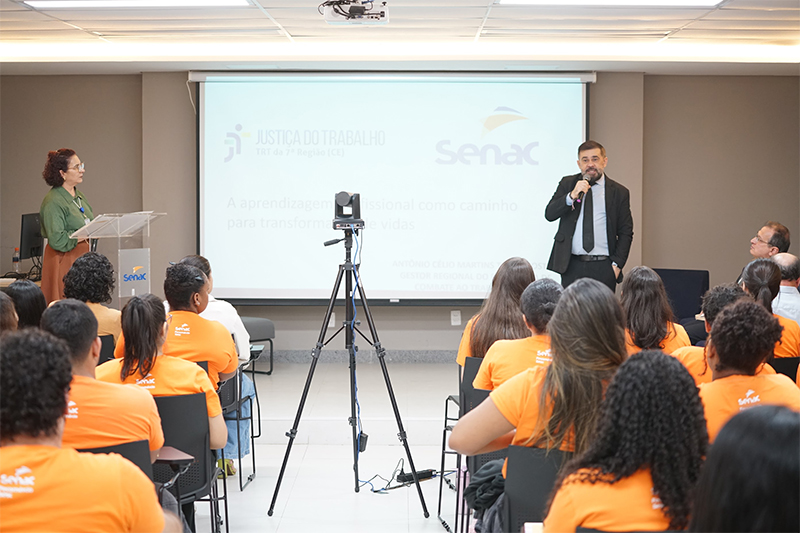 Gestores do Programa de Combate ao Trabalho Infantil e de Estímulo à Aprendizagem da Justiça do Trabalho do Ceará, desembargador Durval Maia e o juiz do trabalho Célio Timbó, promoveram palestra para jovens aprendizes do Serviço Nacional de Aprendizagem Comercial (Senac), em sua unidade localizada no Centro de Fortaleza. A iniciativa, que aconteceu nesta terça-feira (19/8), integra a Semana Nacional da Aprendizagem e teve por objetivo divulgar a aprendizagem profissional como ferramenta para prevenir o trabalho infantil e promover inclusão social. O evento foi transmitido para as demais unidades do Senac no Ceará pelo canal da instituição no YouTube.