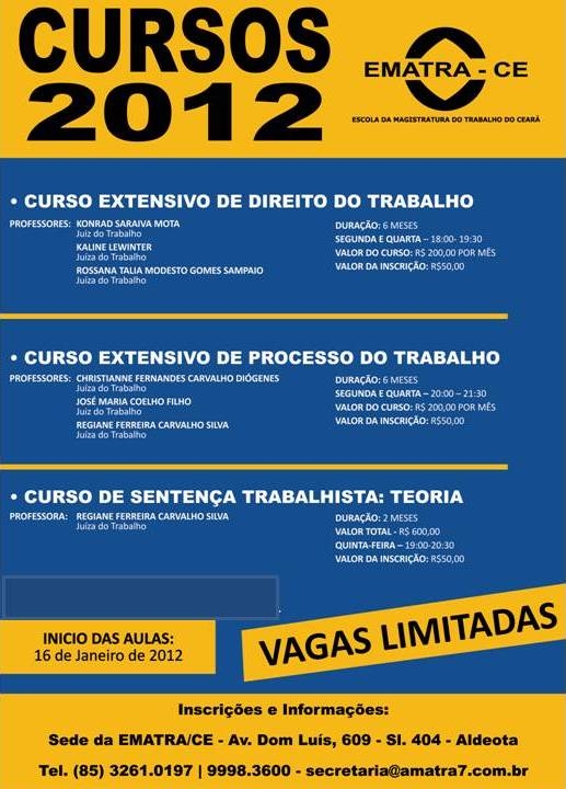 A Associação dos Magistrados do Trabalho da 7ª Região (Amatra 7) publicou o calendário de cursos que serão oferecidos pela instituição no primeiro semestre de 2012. São três opções de cursos para profissionais de direito interessados em aprimorar seus conhecimentos: curso sobre sentença trabalhista e cursos extensivos sobre direito do trabalho e processo do trabalho. Todos se iniciam no dia 16 de janeiro.