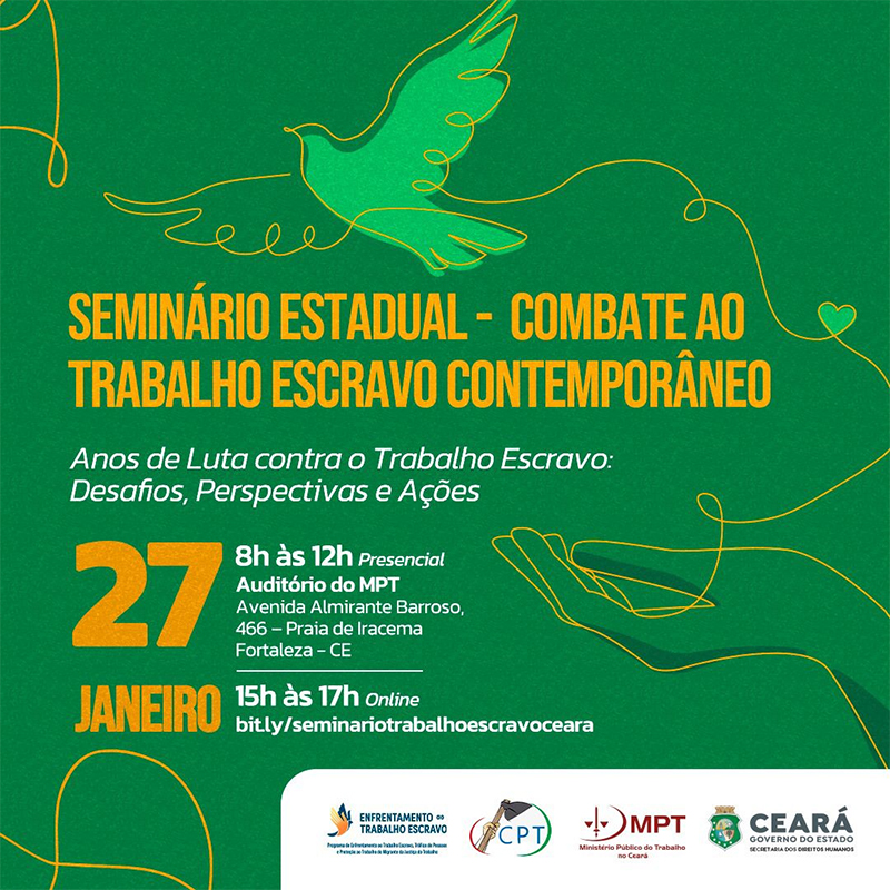 A Secretaria dos Direitos Humanos do Estado do Ceará, o Ministério Público do Trabalho (MPT), o Programa de Enfrentamento ao Trabalho Escravo, Tráfico de Pessoas e Proteção ao Trabalho do Imigrante (Pet/TRT-CE) e a Comissão Pastoral da Terra, por meio da Comissão Estadual para Erradicação do Trabalho Escravo do Estado do Ceará, realizam, no dia 27 de janeiro, Seminário em alusão ao Dia Nacional de Combate ao Trabalho Escravo Contemporâneo – 28 de janeiro.