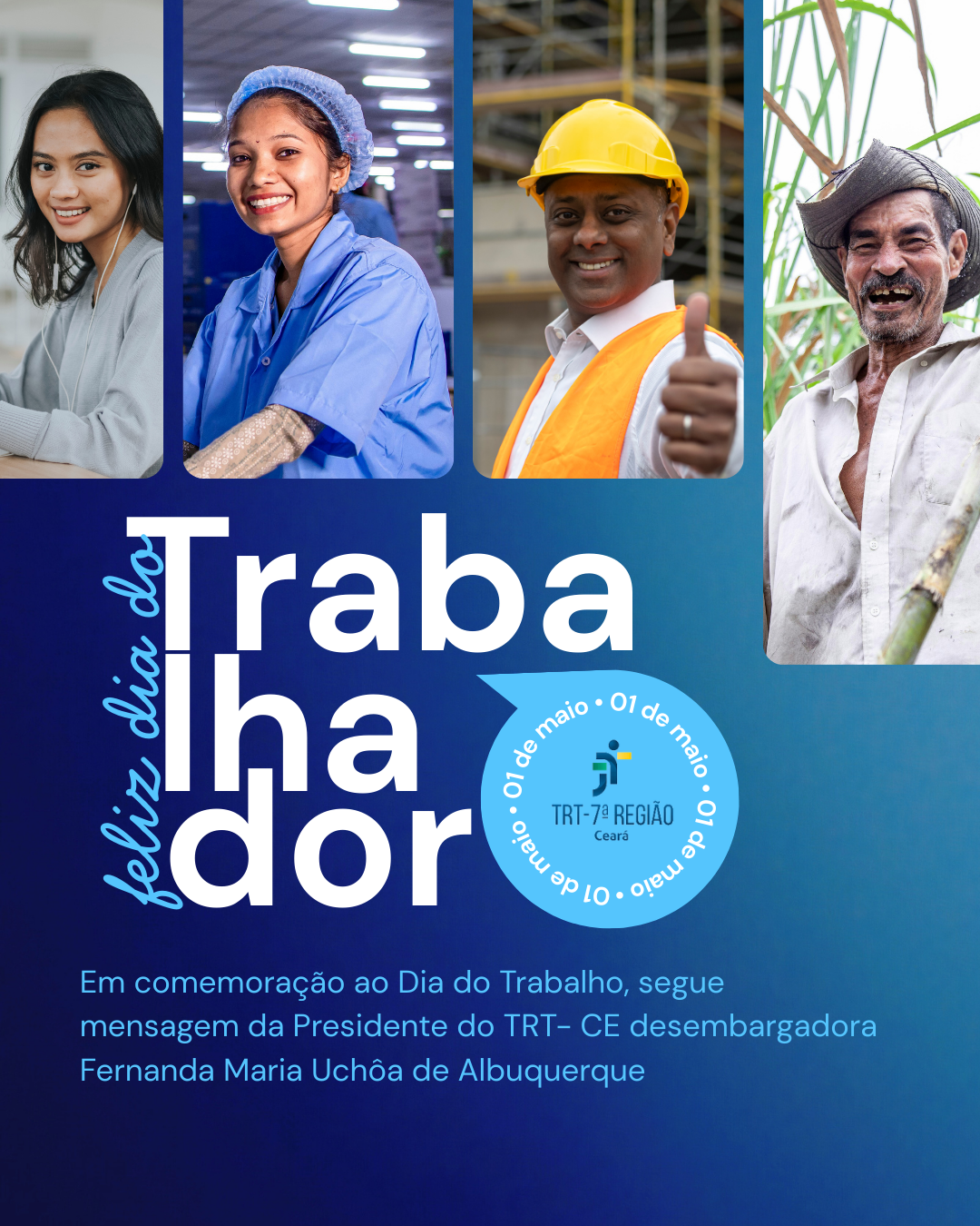 Aos magistrados e magistradas, servidores e servidoras da Justiça do Trabalho do Ceará e todos os trabalhadores e trabalhadoras do Brasil as minhas sinceras felicitações."