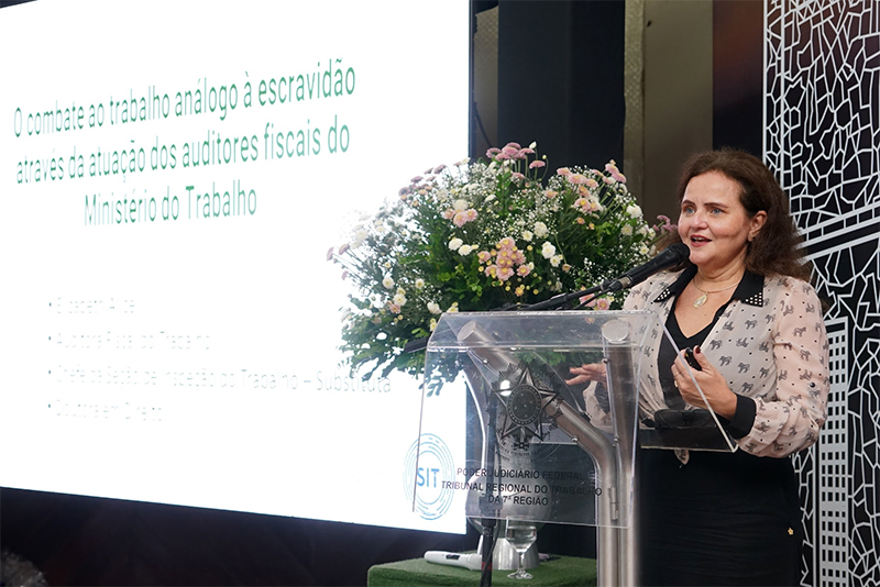A auditora fiscal do Ministério do Trabalho e Emprego no Ceará Elizabeth Alice Barbosa Silva de Araújo foi a palestrante do primeiro painel do Seminário. Ela falou sobre "O combate ao trabalho análogo à escravidão através da atuação dos auditores fiscais do Ministério do Trabalho". A auditora destacou a união de diversos órgãos para combater essa chaga social no nosso país: o trabalho análogo ao de escravo. Ela trouxe a visão da auditoria fiscal do trabalho e como esses profissionais contribuem com a Justiça do Trabalho. A mesa do painel foi presidida pelo desembargador do TRT-CE Francisco José Gomes da Silva e mediada pelo juiz do trabalho Vladimir Paes de Castro.