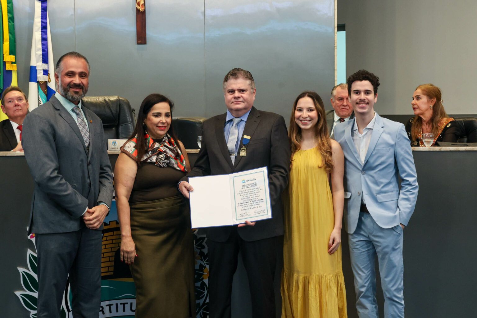 A outorga da comenda ao empresário Francisco Ivens Dias Branco Júnior vem da aprovação do Requerimento n.º 1537/2025. Adicionalmente, o Requerimento n.º 2100/2025 resultou na distinção ao magistrado Manuel Clístenes. Ambas as iniciativas foram propostas pelo vereador Luciano Girão (PDT), segundo vice-presidente da Mesa Diretora da Casa, que destacou a relevante trajetória profissional e a contribuição dos homenageados. A sessão solene reuniu representantes do Poder Judiciário, do setor empresarial, amigos e familiares que prestigiaram a entrega das medalhas.