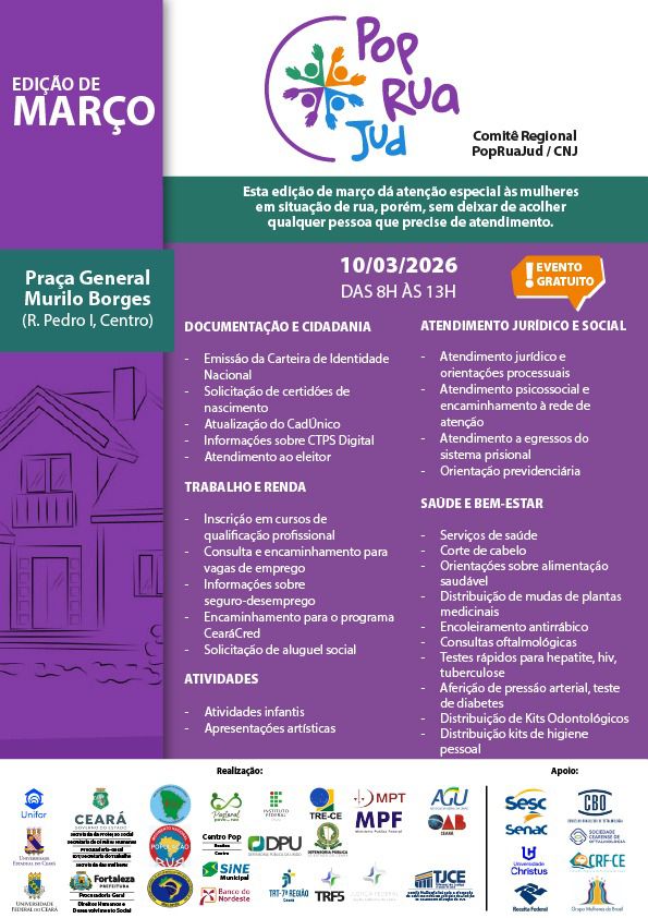 O Tribunal Regional do Trabalho do Ceará (TRT-CE) participará, no próximo dia 10 de março, de mais um mutirão do PopRuaJud, que será realizado das 8h às 13h, na Praça General Murilo Borges (Rua Pedro I, Centro), em Fortaleza. A ação será temática, em alusão ao Dia Internacional da Mulher, tendo como foco central o atendimento às mulheres em situação de rua, embora contemple também qualquer pessoa que necessite de assistência.