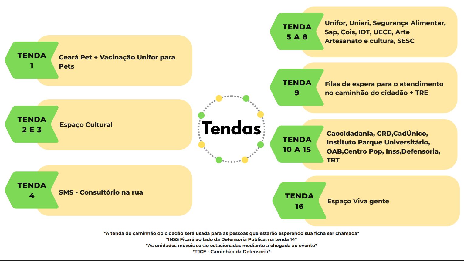 Para facilitar a circulação do público e orientar acerca da localização dos serviços, foi divulgado o mapa oficial da estrutura montada na praça, indicando onde estará cada uma das tendas, estandes e unidades móveis participantes.