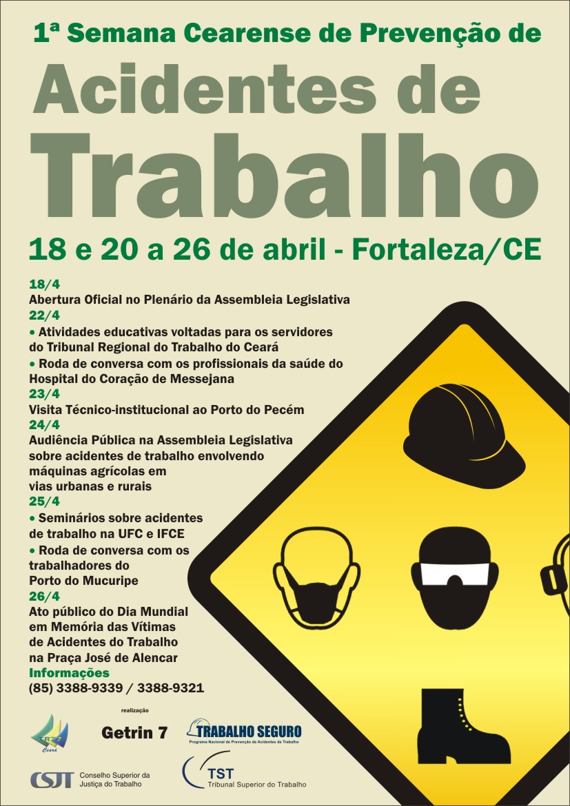 Vinte e duas instituições públicas e privadas realizam entre os dias 22 a 26 de abril a 1ª Semana Cearense de Prevenção de Acidentes de Trabalho. Juízes, médicos, enfermeiros, parlamentares, sindicalistas, empresários, advogados e outros profissionais visitam portuários, profissionais de saúde e estudantes para falar sobre o tema saúde do trabalhador. A Semana integra o Programa Nacional de Prevenção de Acidentes de Trabalho (Pnpat), articulado no Estado pelo Tribunal Regional do Trabalho do Ceará (TRT/CE).