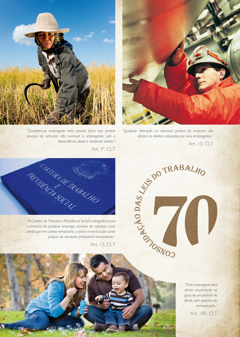 Divulgação da Cartilha dos Direitos Trabalhistas. Com 60 páginas, a publicação tem a finalidade de divulgar, de forma clara e objetiva, os direitos básicos dos trabalhadores. Serão impressas 5.000 unidades. Servidores irão distribuí-las em escolas públicas e nos eventos que serão realizados em comemoração aos 70 anos da CLT;