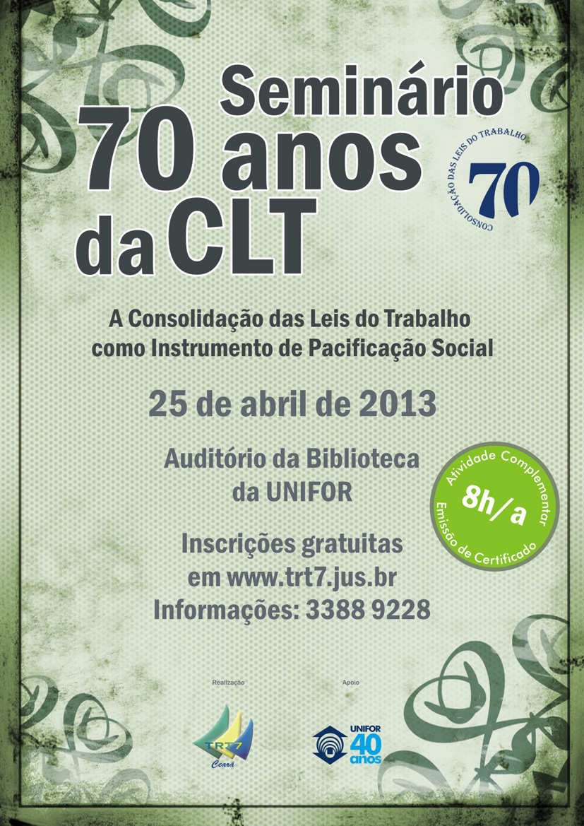 Programação: Além do seminário, o TRT/CE realizará três sessões solenes para marcar os 70 anos da lei criada para unificar a legislação trabalhista existente no Brasil até a década de 1940 e também para regulamentar relações individuais e coletivas de trabalho. No dia 22 de abril será realizada uma sessão solene na Assembleia Legislativa. No dia 23 abril, será a vez do Plenário do TRT/CE prestar homenagem a CLT. Por fim, a Câmara de Vereadores de Fortaleza realiza sessão comemorativa no dia 30 de abril.