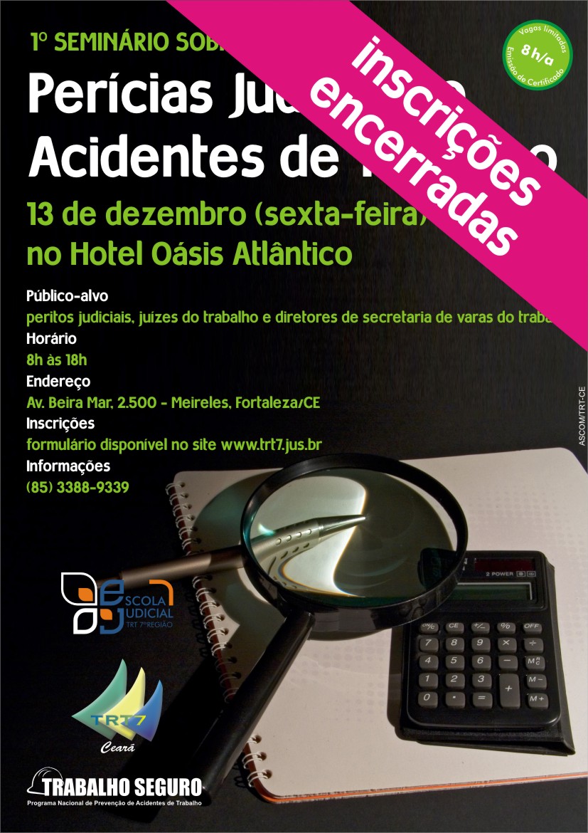 As inscrições para o seminário são gratuitas e podem ser realizadas no site do TRT/CE. São apenas 50 vagas destinadas exclusivamente a peritos judiciais, juízes do trabalho e diretores de secretaria de varas do trabalho. Elas serão preenchidas por ordem de solicitação. O evento integra as atividades do Programa Trabalho Seguro no Ceará.