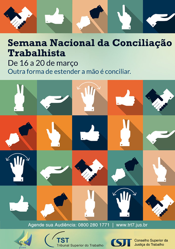 Campanha: A campanha de divulgação idealizada pelo CSJT mostra a Justiça do Trabalho como célere e acessível. Ela se baseia no conceito de que a conciliação é um gesto de boa vontade e tem como slogan “Outra forma de estender a mão é conciliar”. A Divisão de Comunicação Social do TRT/CE já preparou plano de comunicação que inclui, entre as várias peças publicitárias, placas de outdoors nas principais avenidas de Fortaleza.