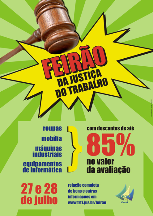 Móveis, roupas, calçados, equipamentos de informática, eletrônicos, material para salão de beleza, mobília escolar e máquinas industriais com até 85% de desconto no valor de avaliação estão entre os bens que serão vendidos no Feirão da Justiça do Trabalho, que ocorre segunda e terça-feira (27 e 28 de julho), das 9h às 11h, em dois depósitos localizados em Fortaleza e Eusébio (endereços abaixo).