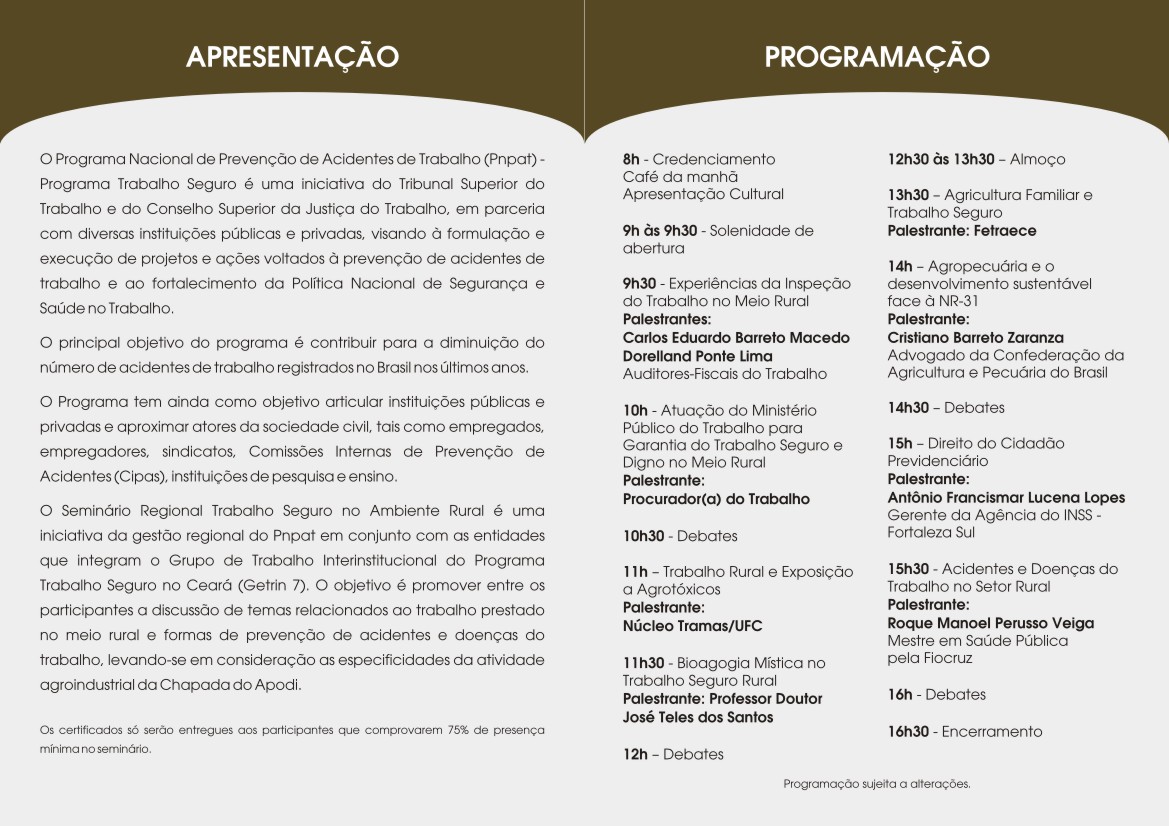 Além das consequências do uso indiscriminado de agrotóxicos na região, o Seminário também terá palestras sobre direito previdenciário e agricultura familiar e Membros do Ministério Público do Trabalho falarão sobre a atuação do órgão para garantir um trabalho digno no campo. A programação também inclui relatos de auditores fiscais do trabalho sobre o trabalho de fiscalização rural.