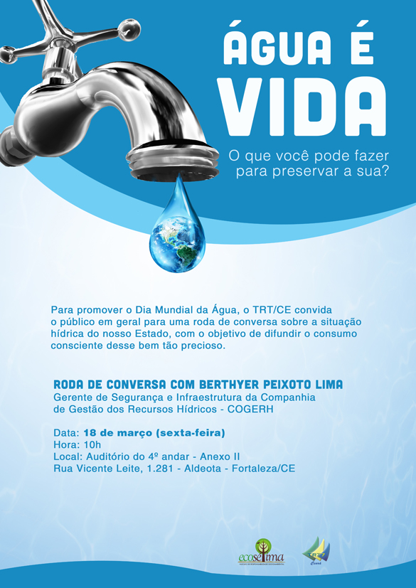 Para promover o Dia Mundial da Água, o Tribunal Regional do Trabalho do Ceará realiza, nesta sexta-feira (18/3), às 10h, uma roda de conversa sobre a situação hídrica do nosso Estado, com o objetivo de difundir o consumo consciente da água. O debate será conduzido pelo gerente de Segurança e Infraestrutura da Companhia de Gestão dos Recursos Hídricos (Cogerh), Berthyer Peixoto Lima, no auditório do TRT/CE. O evento é aberto ao público em geral e não é necessário realizar inscrição.