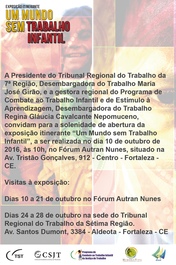 "Um Mundo Sem Trabalho Infantil" é o tema da exposição que o Tribunal Regional do Trabalho do Ceará inaugura na segunda-feira (10/10), às 10h, no Fórum Autran Nunes. Promovida pelo Tribunal Superior do Trabalho (TST), a mostra faz parte das ações do Programa de Combate ao Trabalho Infantil e de Estímulo à Aprendizagem da Justiça do Trabalho e tem por objetivo sensibilizar a sociedade para o problema da exploração da mão de obra infantil.