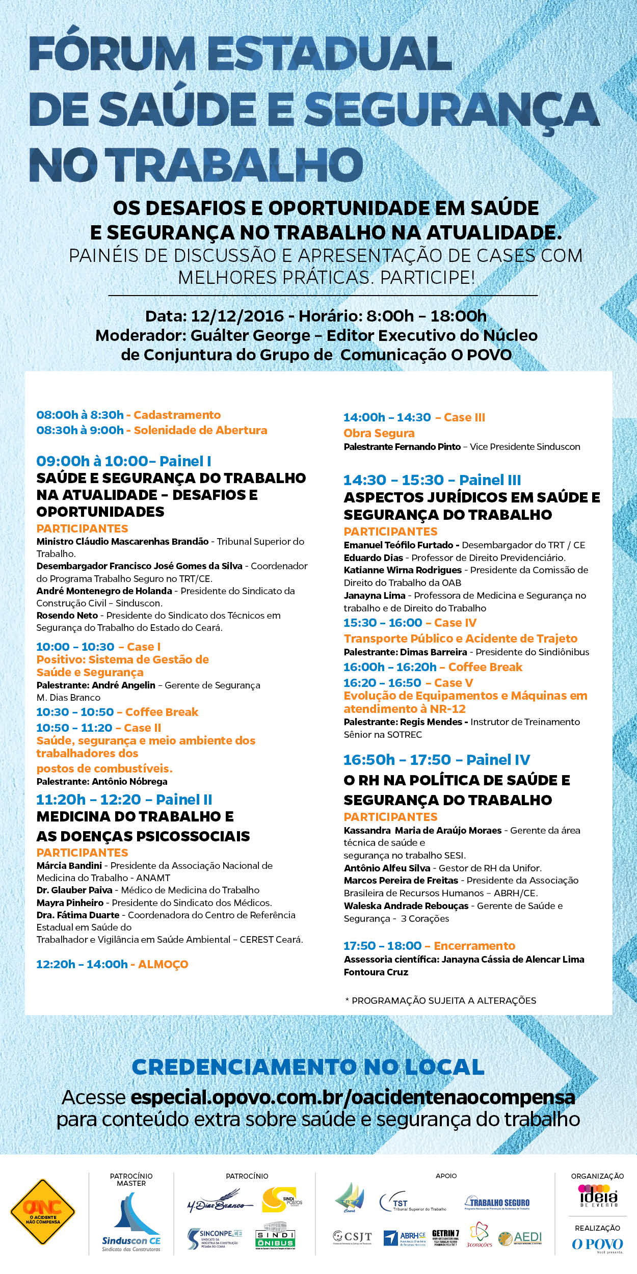 O evento tem como tema “Prevenção: responsabilidade de todos” e acontece no auditório do TRT/CE, das 8h às 18h. A programação completa está disponível na página especial.opovo.com.br/oacidentenaocompensa.