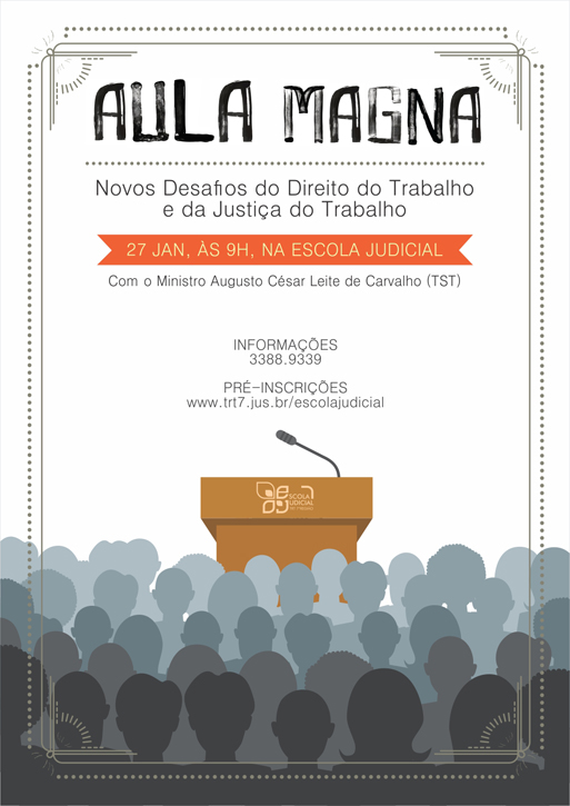 Para marcar o início do ano letivo de 2017 da Escola Judicial da Justiça do Trabalho do Ceará, o ministro do Tribunal Superior do Trabalho (TST) Augusto César Leite de Carvalho realizará aula magna, no dia 27 de janeiro, no auditório do Anexo 2 do TRT/CE. O tema da palestra é "Novos desafios do Direito do Trabalho e da Justiça do Trabalho". O evento é gratuito e aberto ao público em geral. As inscrições devem ser feitas em formulário no site da Escola.
