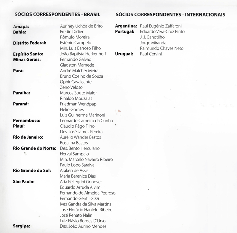 Entre sócios-correspondentes, já confirmados, há notáveis juristas, como Jorge Miranda e J.J. Canotilho, ambos de Portugal; Raul Cervini, do Uruguai; Raúl Zaffaroni, ministro da Suprema Corte Argentina; Ives Gandra da Silva Martins; Ada Pellegrini Grinover; João Baptista Herkenhoff; Fernando de Almeida Pedroso; Fernando Gentil Gizzi; Friedman Wendpap, Rômulo Moreira; Zeno Veloso; Paulo Lopo Saraiva, André Meira, entre outros.