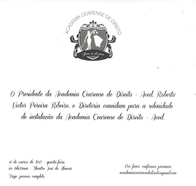 A solenidade de instalação da Academia Cearense de Direito (Aced) acontece nesta quarta-feira (15/3), às 19h30, no Teatro José de Alencar, e deve reunir autoridades e juristas de todo o País. A instituição, que nasce com o objetivo de aprofundar o estudo do Direito em todos os seus ramos, será presidida pelo advogado e professor universitário Roberto Victor Ribeiro.