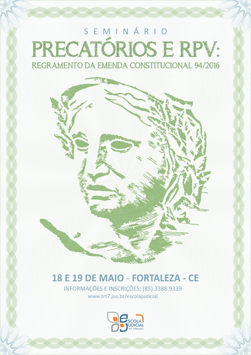 A Escola Judicial do TRT/CE promove, nos dias 18 e 19 de maio, o seminário “Precatórios e RPV: Regramento da Emenda Constitucional 94/2016”. O evento visa discutir as mudanças no pagamento de precatórios, colocando em destaque a criação do regime especial que beneficiou milhares de brasileiros. O seminário ocorrerá no auditório da Escola e irá contar com a presença de seis palestrantes, dentre eles o ministro Cláudio Mascarenhas Brandão, do Tribunal Superior do Trabalho.
